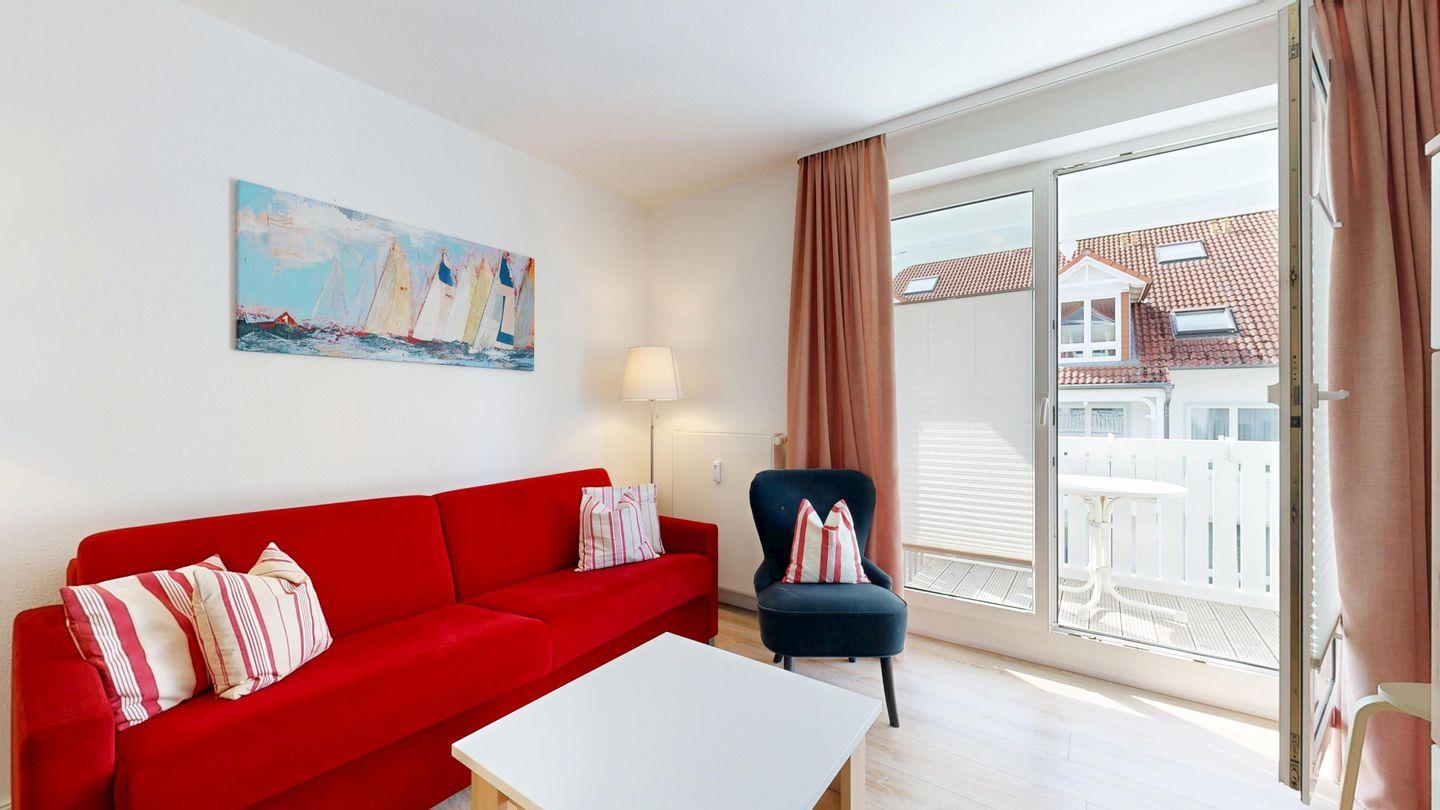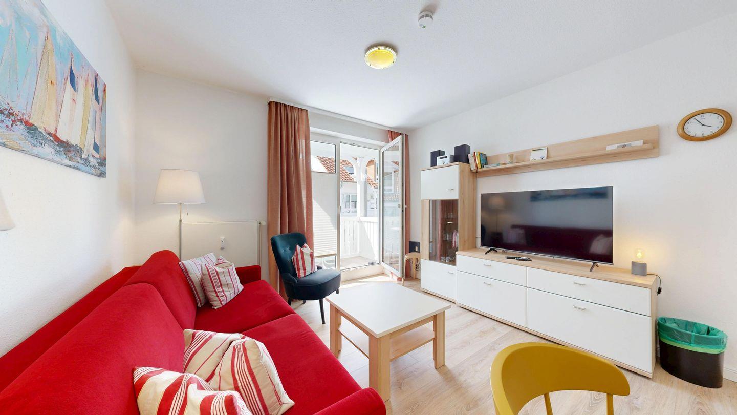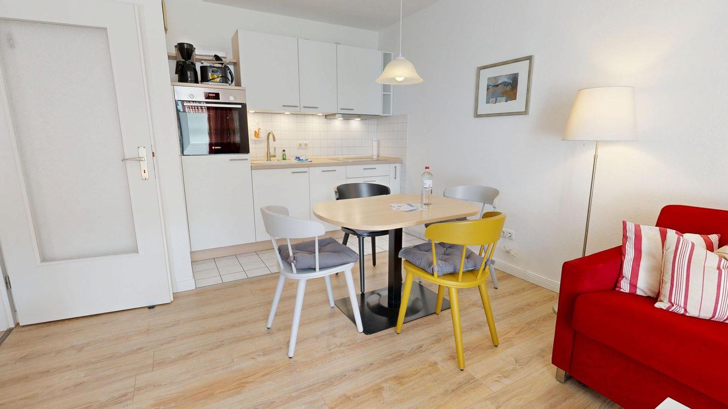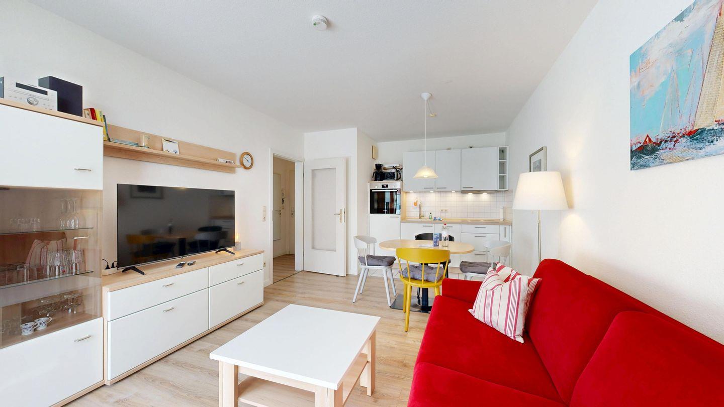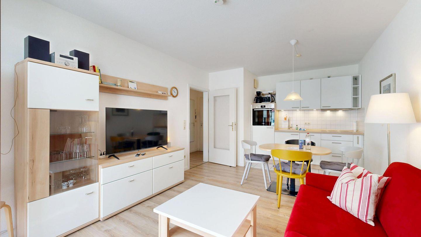 * Wohnzimmer: Couchgarnitur (Schlafgelegenheit für 2 Personen), Kabel-TV, Stereoanlage, Internetanschluss (WLAN), Esstisch