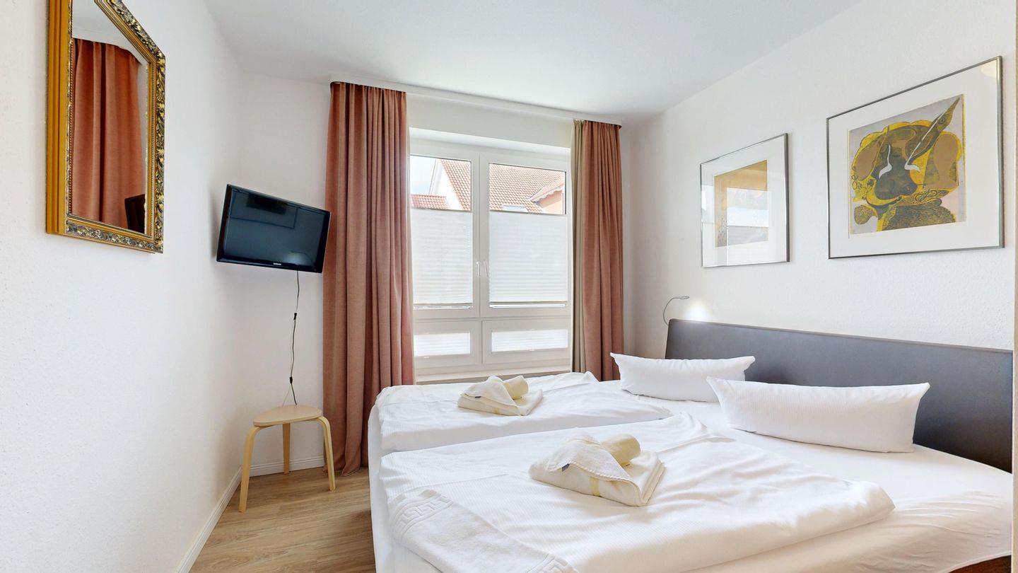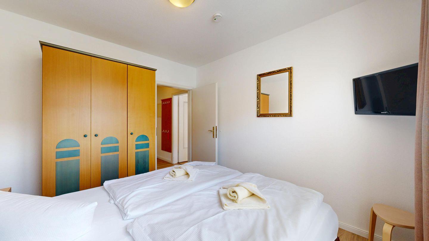 * 1 Schlafzimmer mit einem Boxspringbett (Doppelbett) und TV
