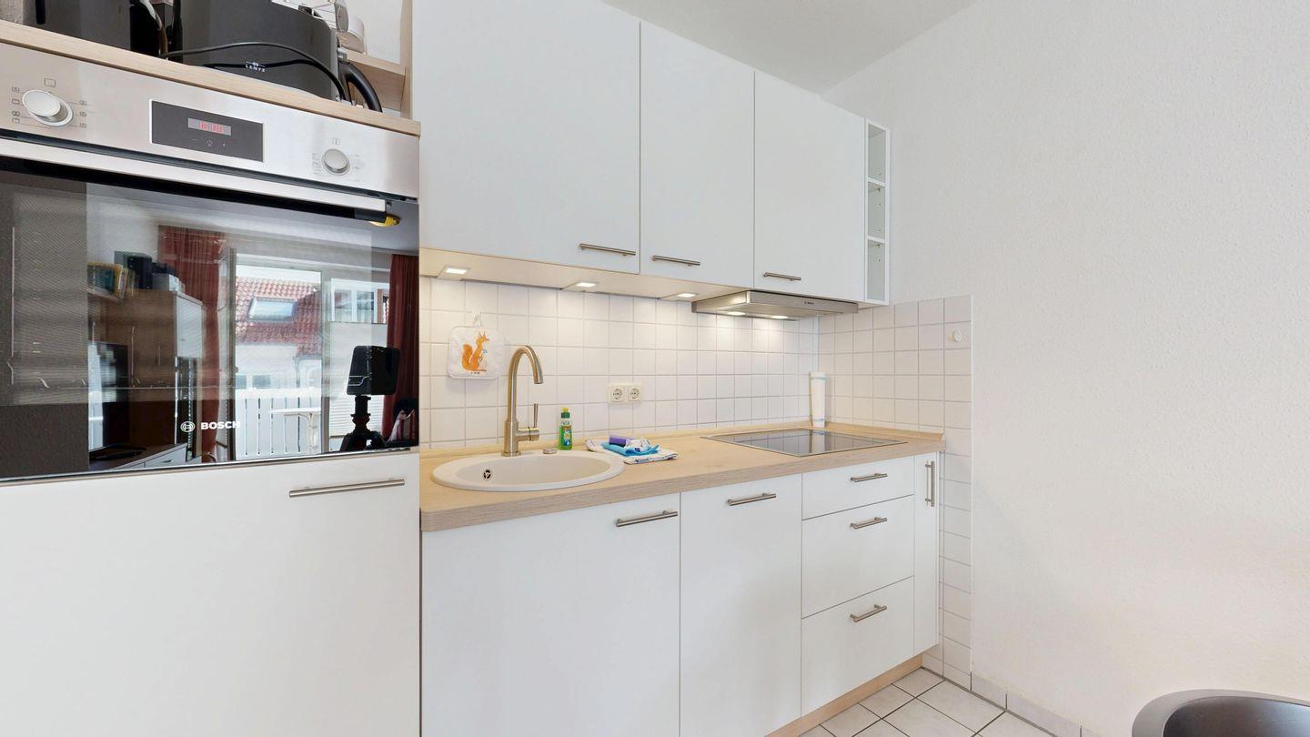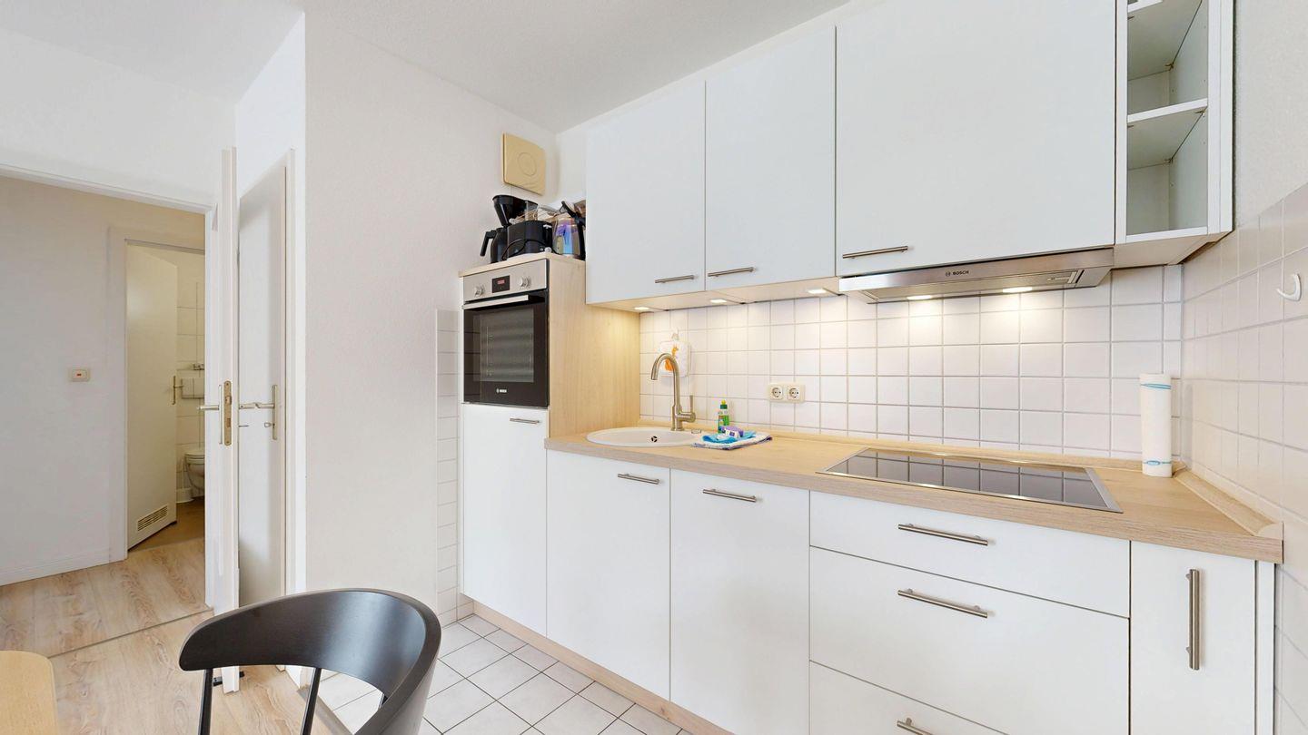 * Küchenzeile mit Spülmaschine, Backofen, Ceranfeld, Mikrowelle, Kaffeemaschine, Toaster und Kühlschrank mit Gefrierfach