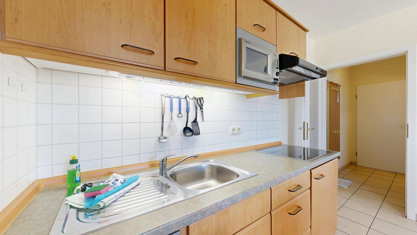 * Küchenzeile mit Spülmaschine, Ceranfeld, Mikrowelle, Kaffeemaschine, Toaster und Kühlschrank mit Gefrierfach