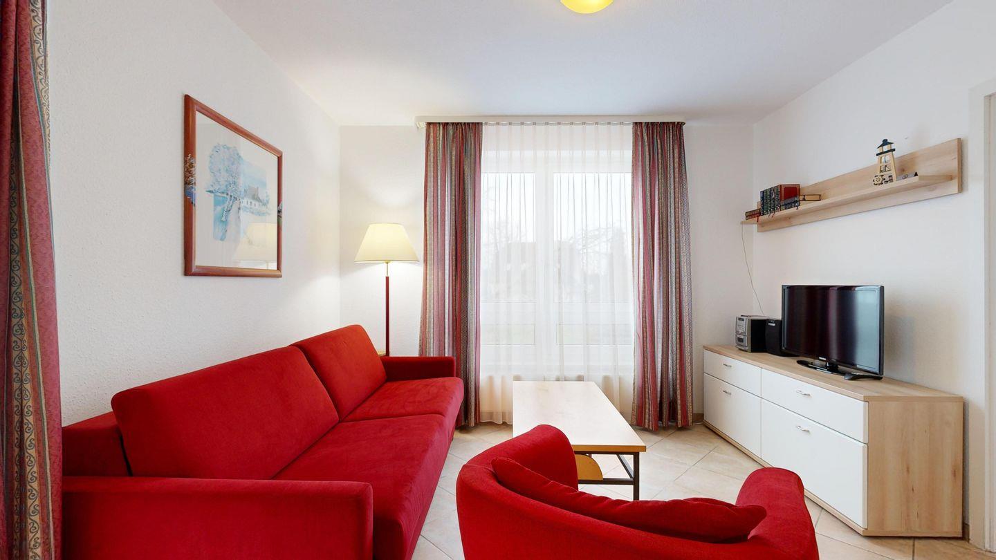 * Wohnzimmer: Couchgarnitur (Schlafgelegenheit für 2 Personen), Kabel-TV, Stereoanlage, Internetanschluss-WLAN, Esstisch