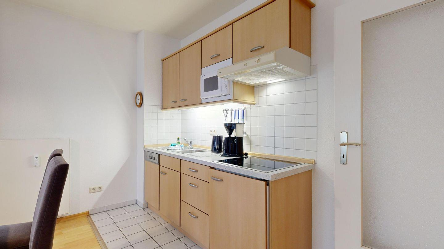 * Küchenzeile mit Spülmaschine, Ceranfeld, Mikrowelle, Kaffeemaschine, Toaster und Kühlschrank mit Gefrierfach