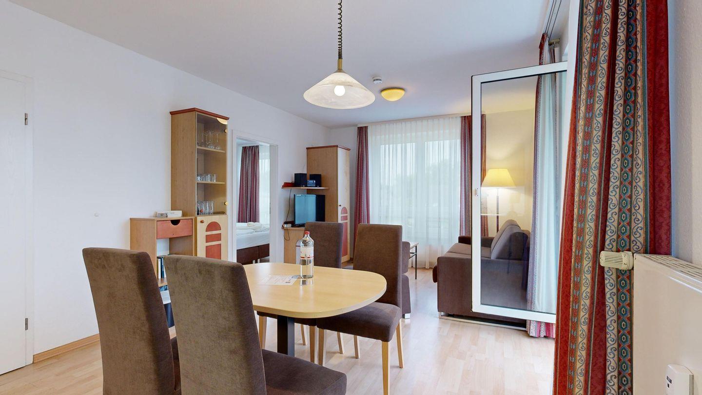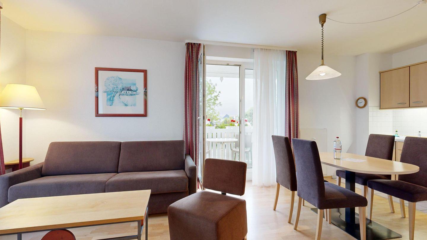 * Wohnzimmer: Couchgarnitur (Schlafgelegenheit für 2 Personen), Kabel-TV, Stereoanlage, Internetanschluss-WLAN, Esstisch