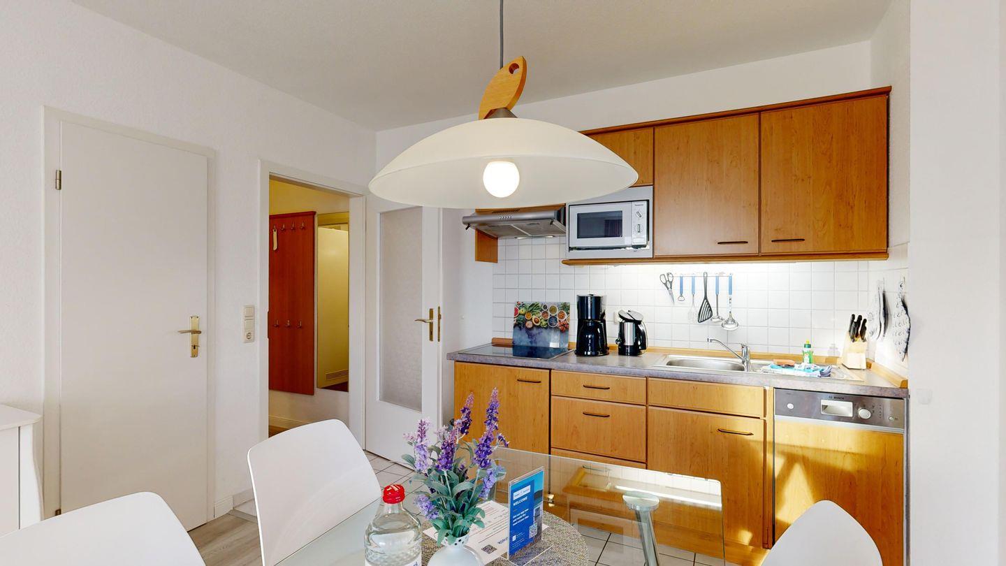 * Küchenzeile mit Spülmaschine, Ceranfeld, Mikrowelle, Kaffeemaschine, Toaster und Kühlschrank mit Gefrierfach