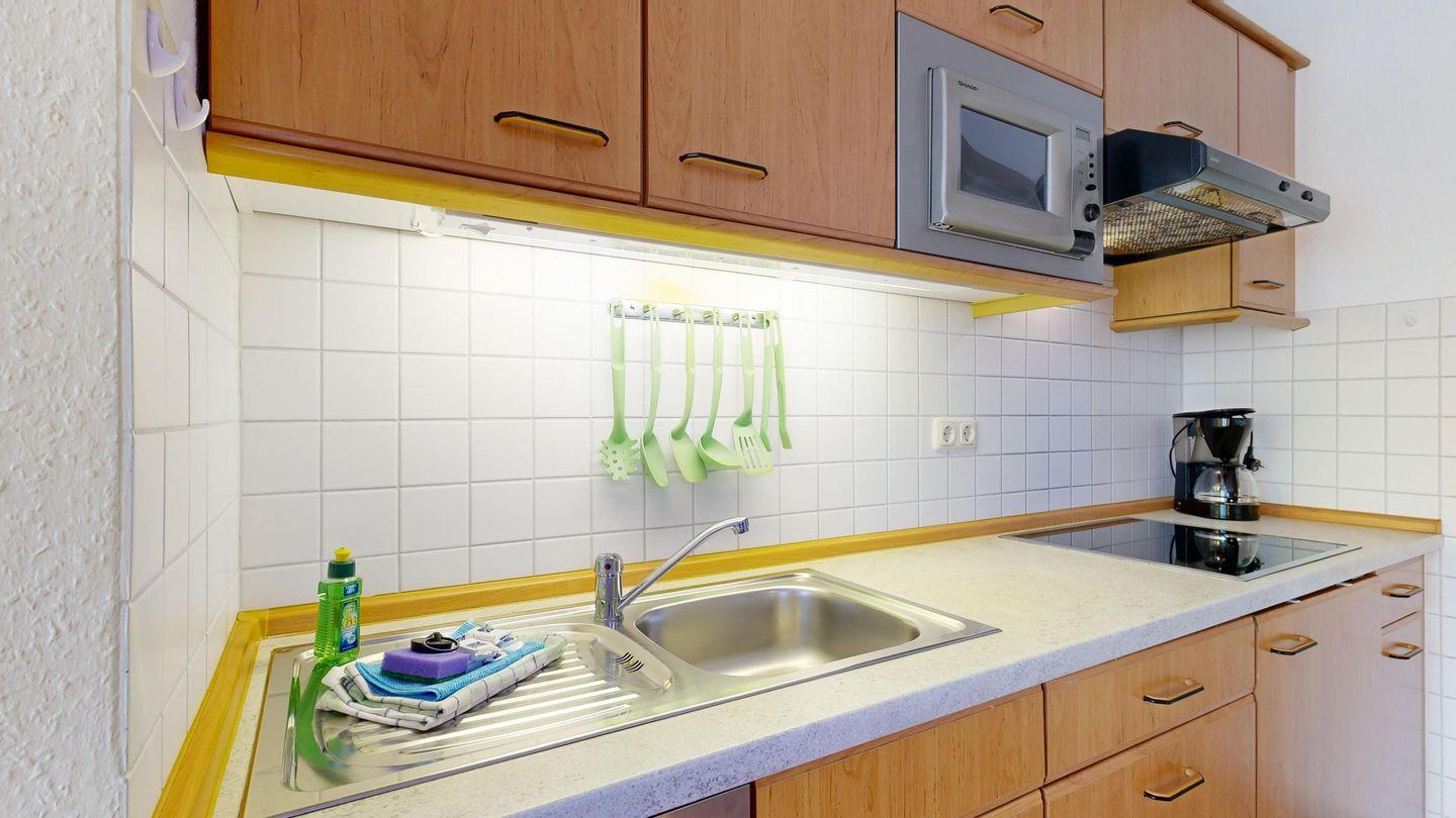 * Küchenzeile mit Spülmaschine, Ceranfeld, Mikrowelle, Kaffeemaschine, Toaster und Kühlschrank mit Gefrierfach