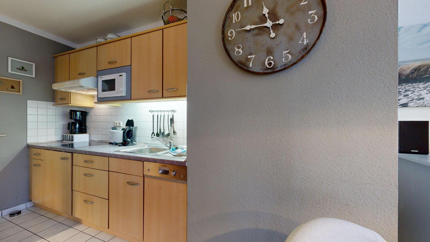 * Küchenzeile mit Spülmaschine, Ceranfeld, Mikrowelle, Kaffeemaschine, Toaster und Kühlschrank mit Gefrierfach