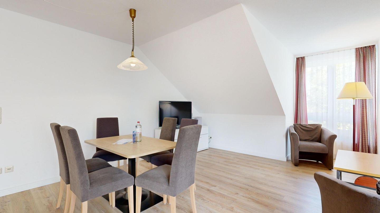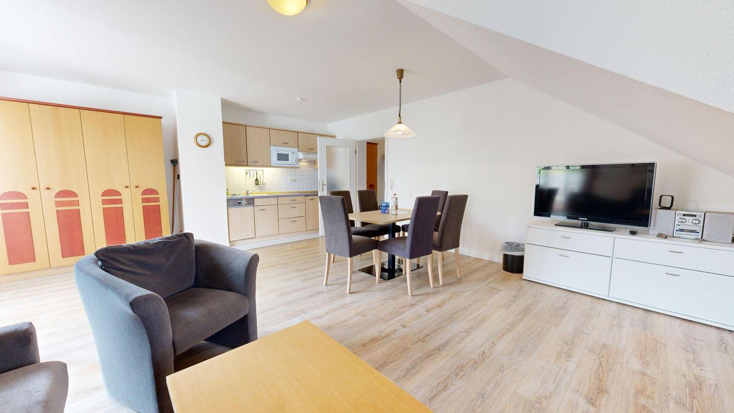 * Wohnzimmer: Couchgarnitur (Schlafgelegenheit für 2 Personen), Kabel-TV, Stereoanlage, Internetanschluss (WLAN), Esstisch