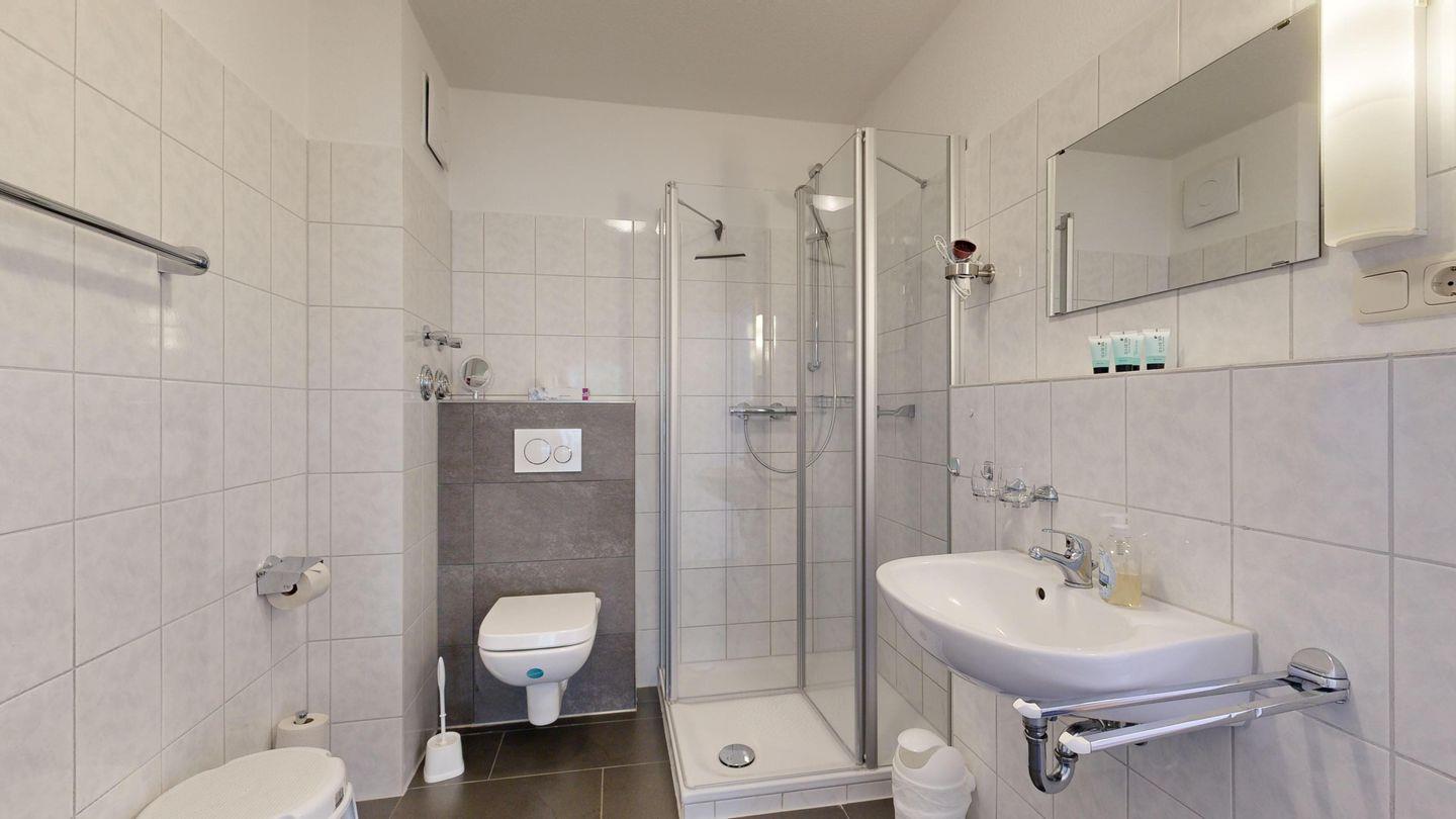 * Dusche (Tiefeinsteiger), WC, Haartrockner