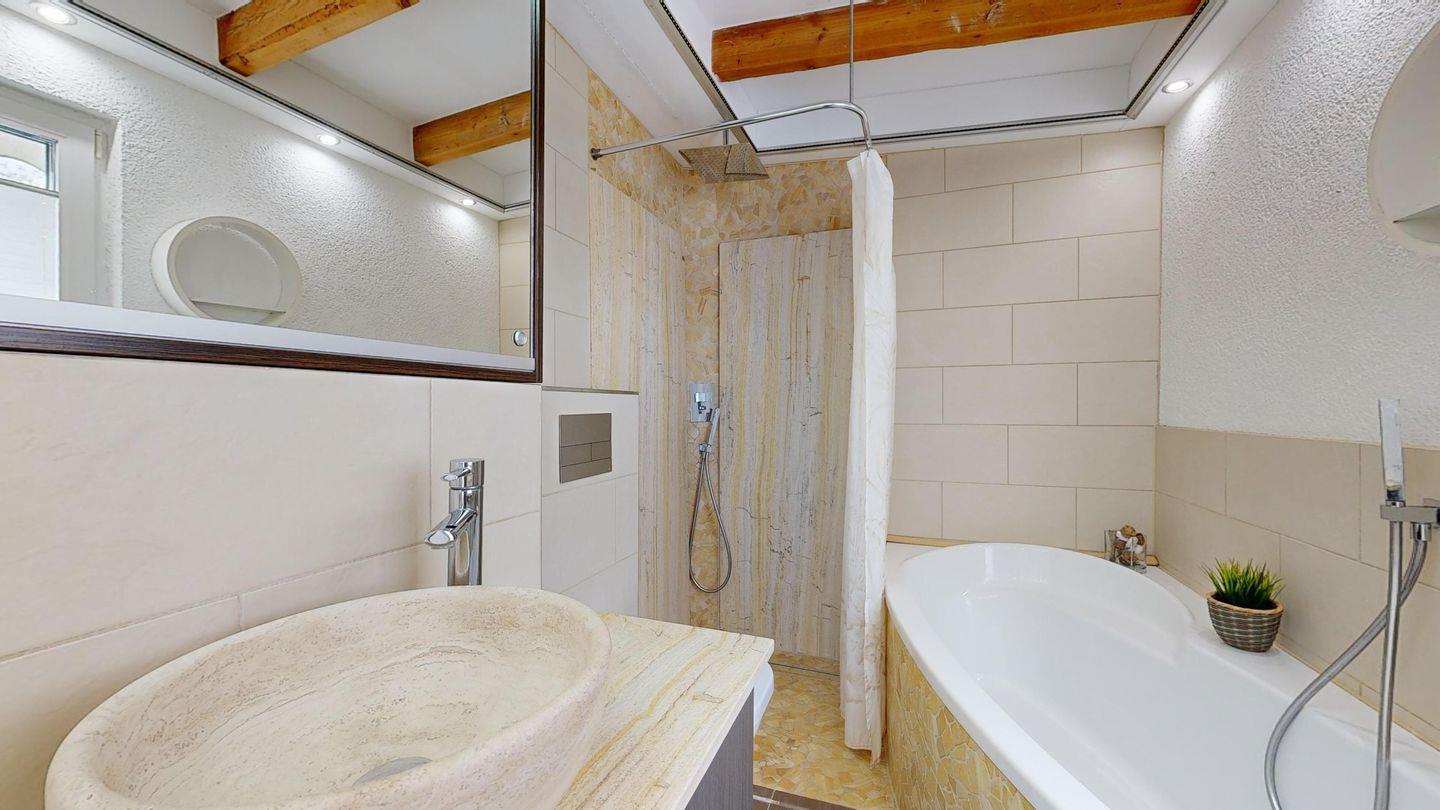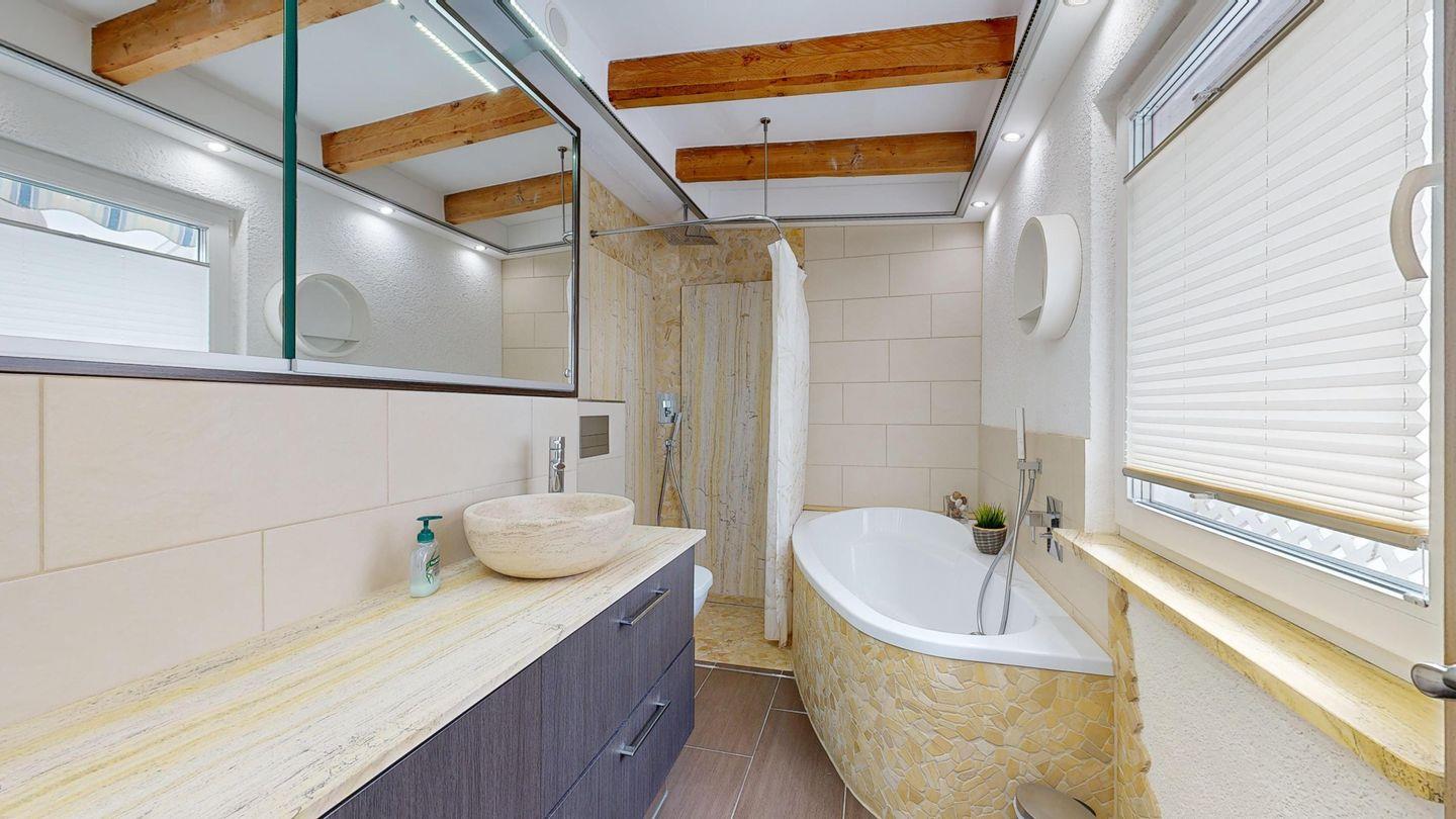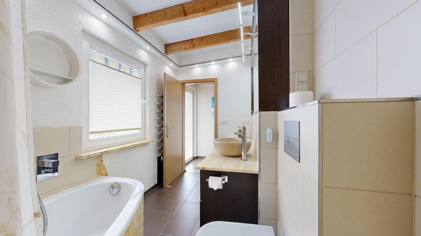 * 1 Badezimmer mit Badewanne, Dusche, WC, Föhn und Fußbodenheizung