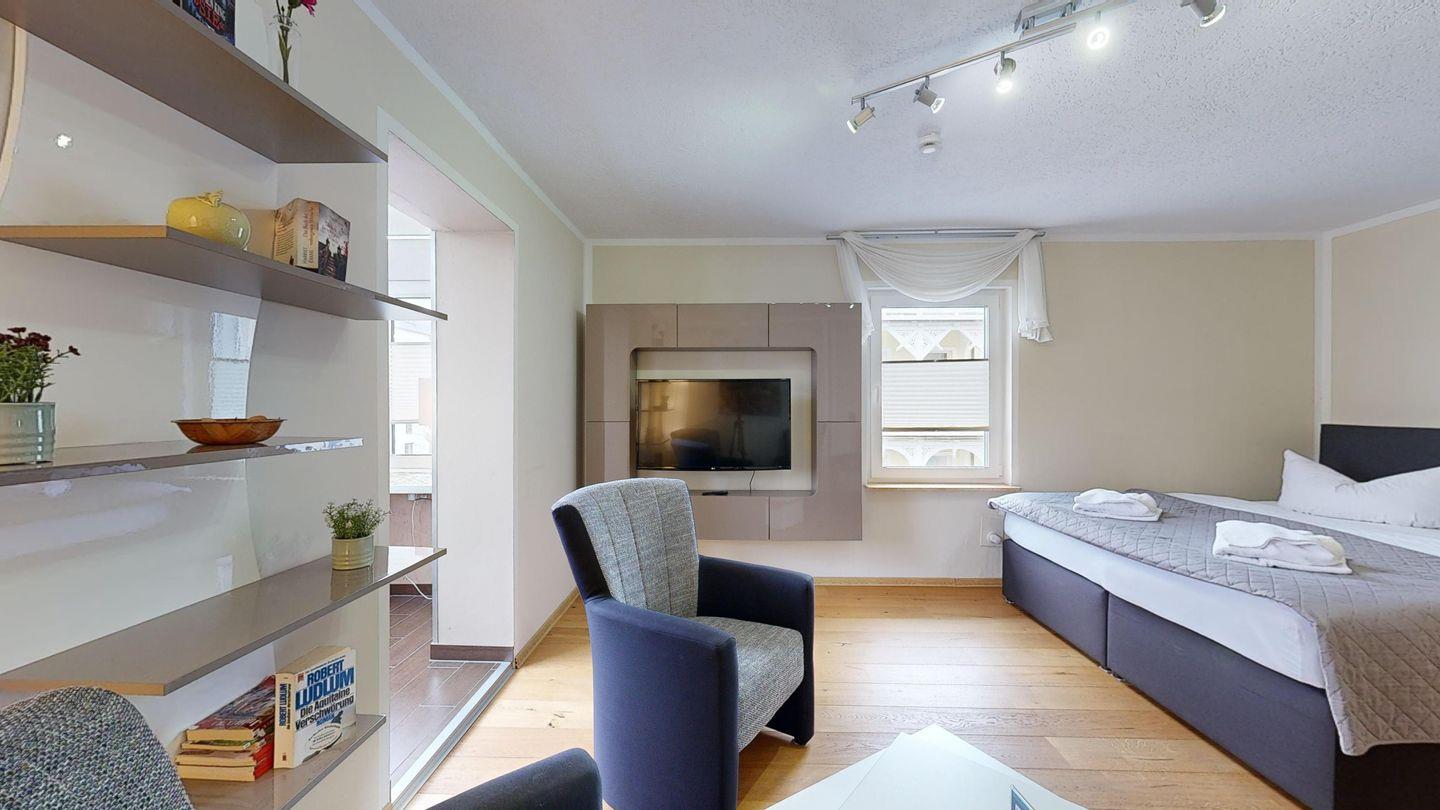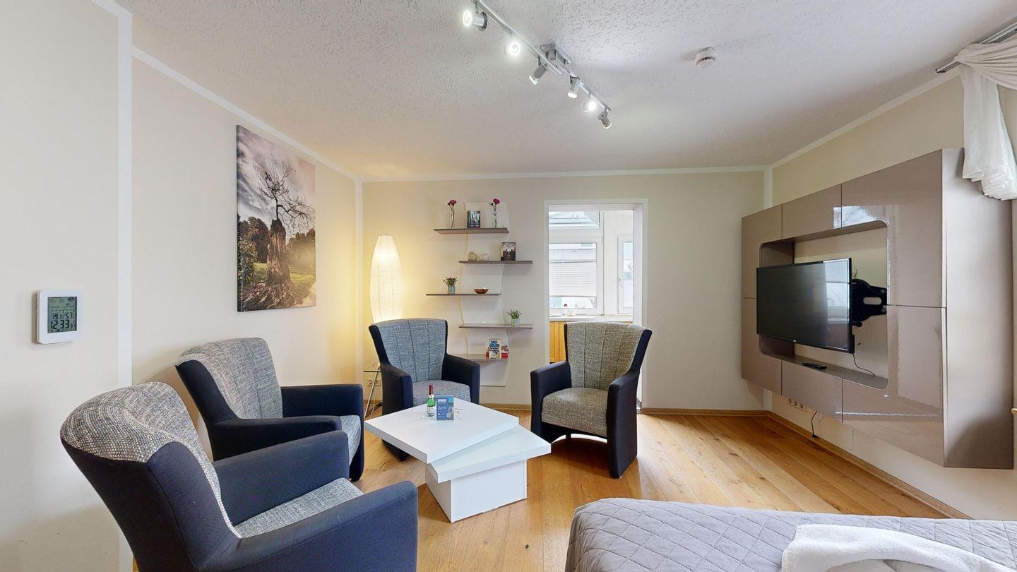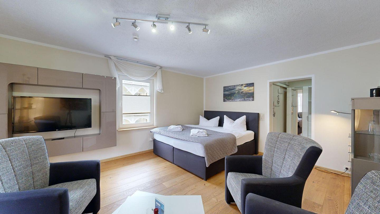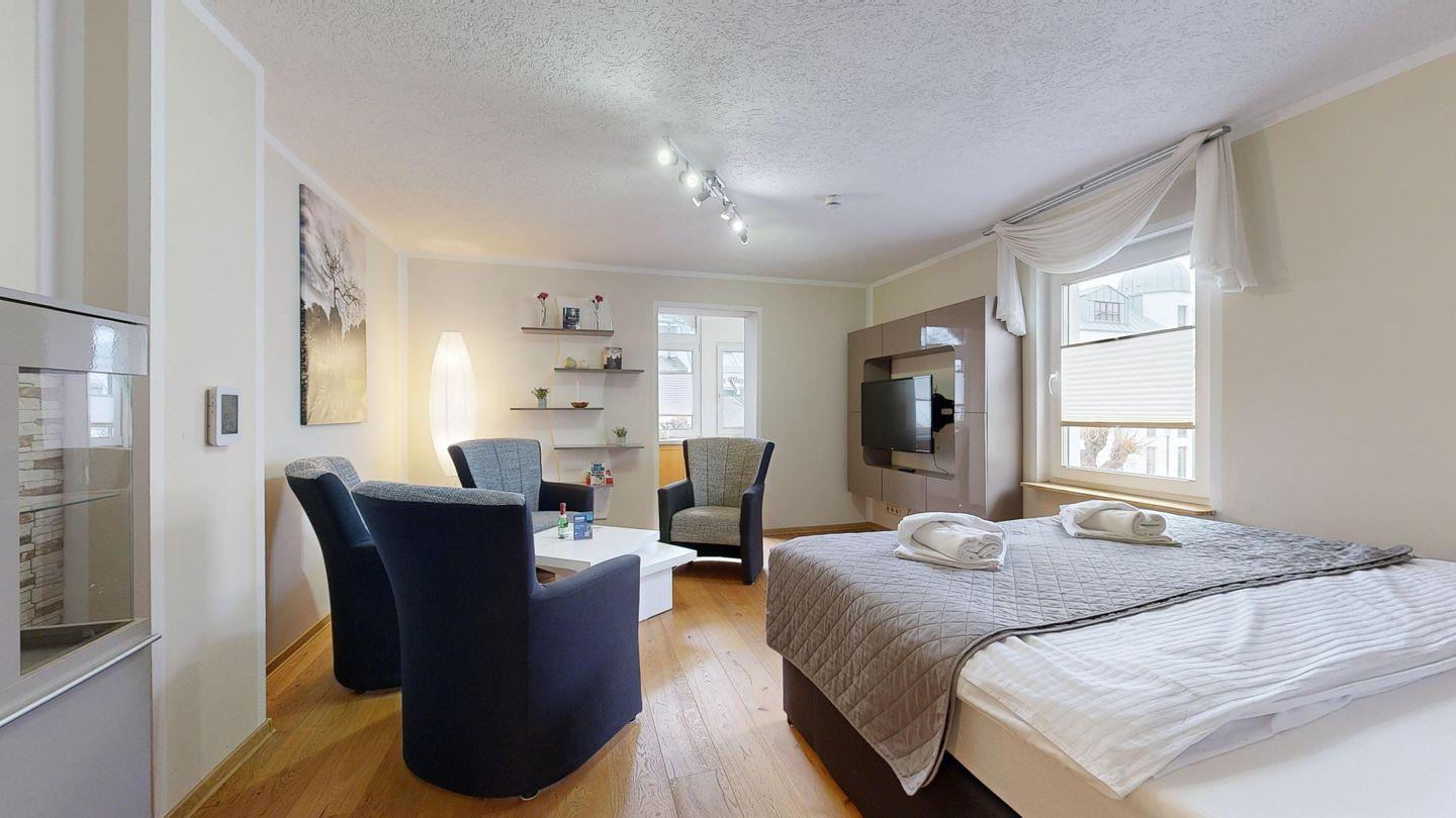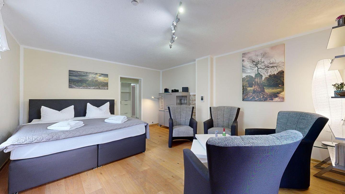 * Großes Wohn-/Schlafzimmer mit Echtholzpakett und Bodenheizung, 4 Sessel, Kabel-TV, WLAN-Internetanschluss und Zugang zur Loggia. Im Wohnzimmer gibt es ein Boxspringbett.