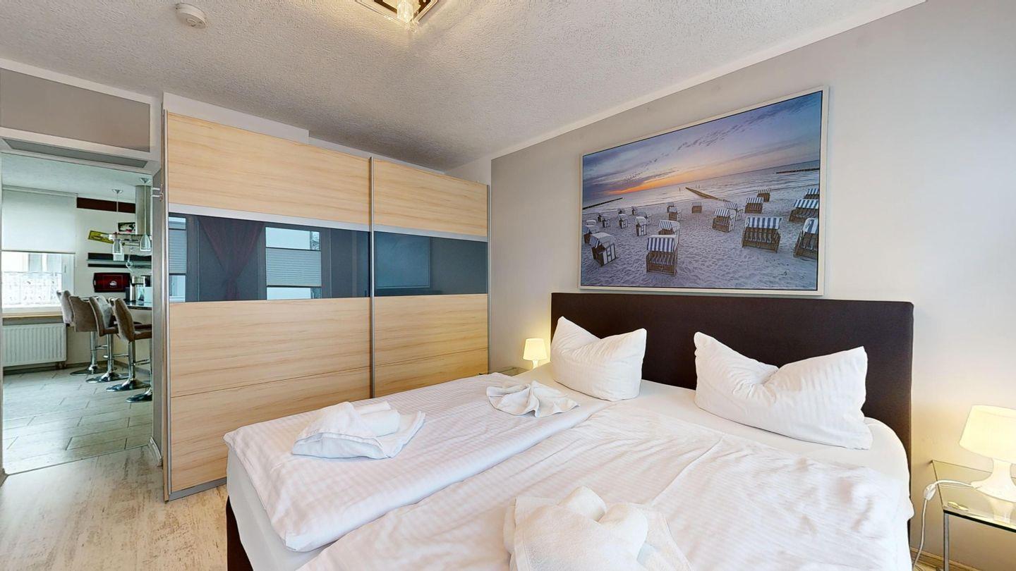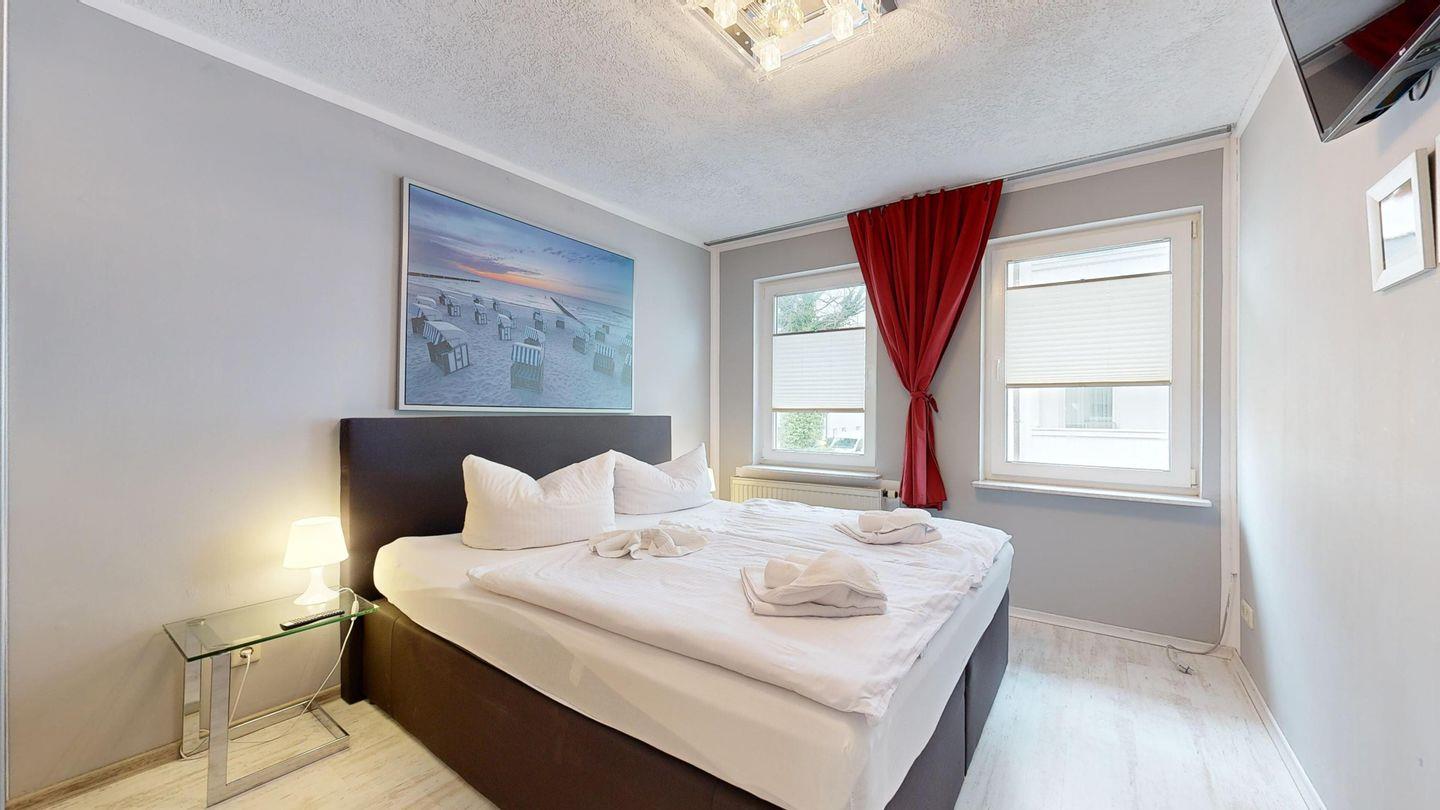*1 Schlafzimmer mit einem Boxspringbett und TV