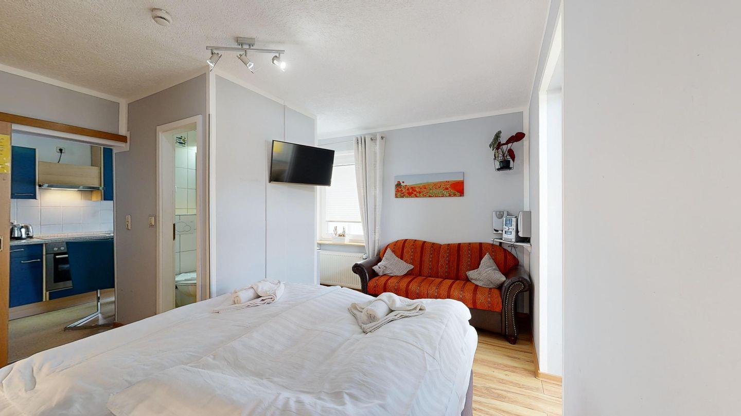 * Kombinierter Wohn-/Schlafzimmer: Boxspringbett, Couch, Kabel-TV, WLAN-Internetanschluss