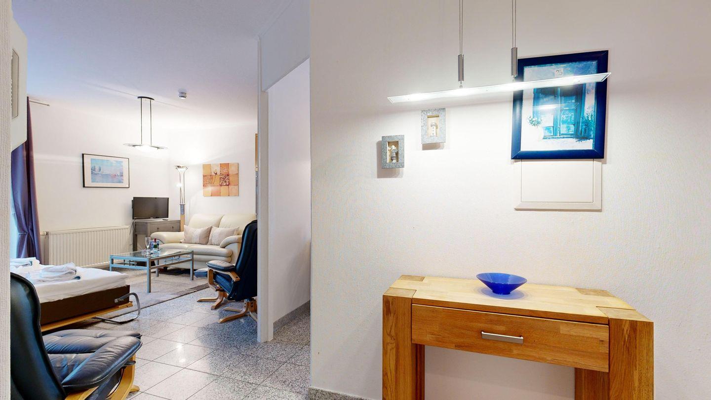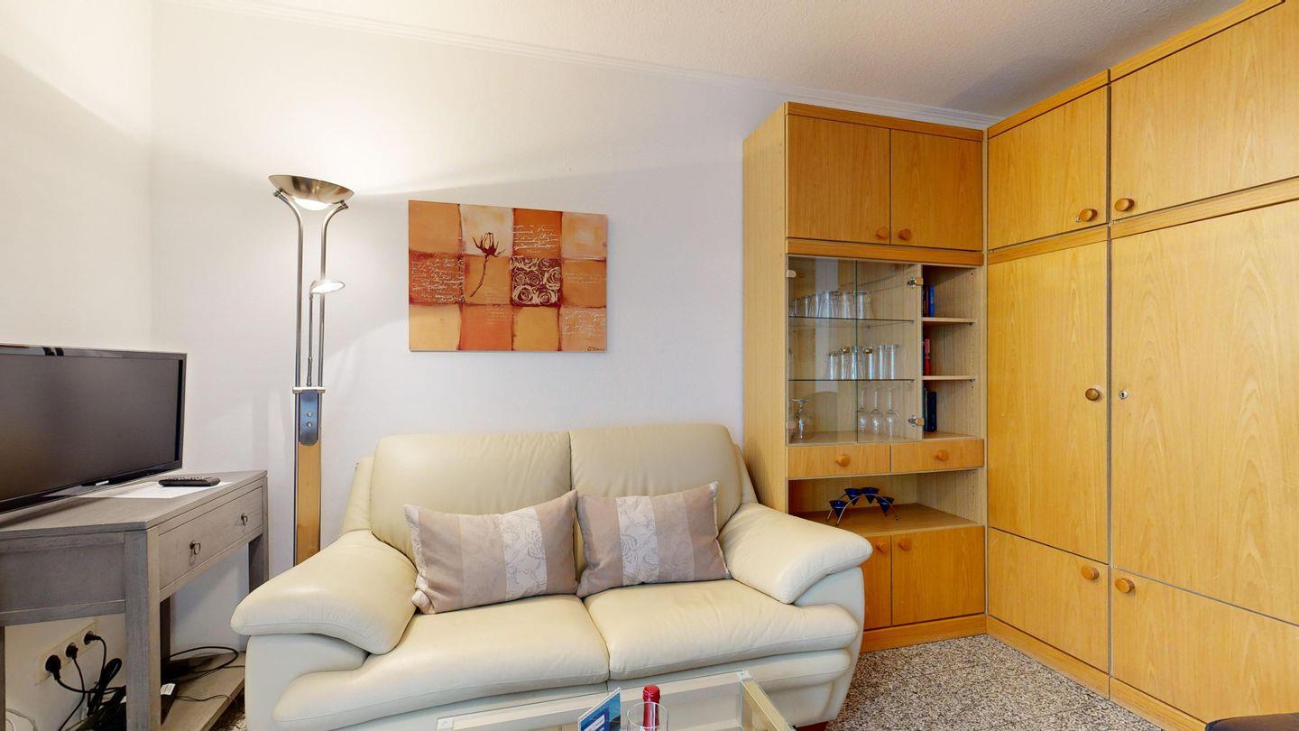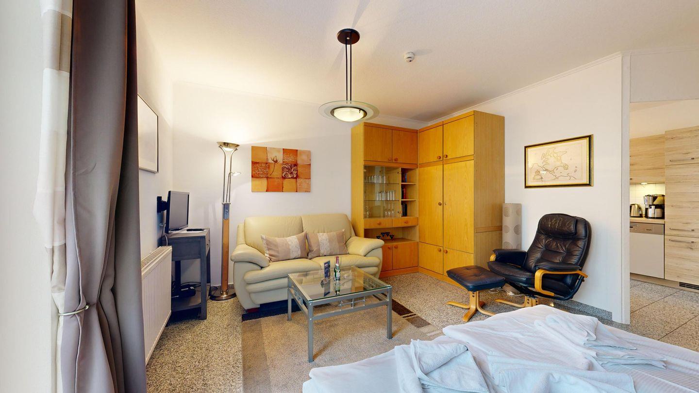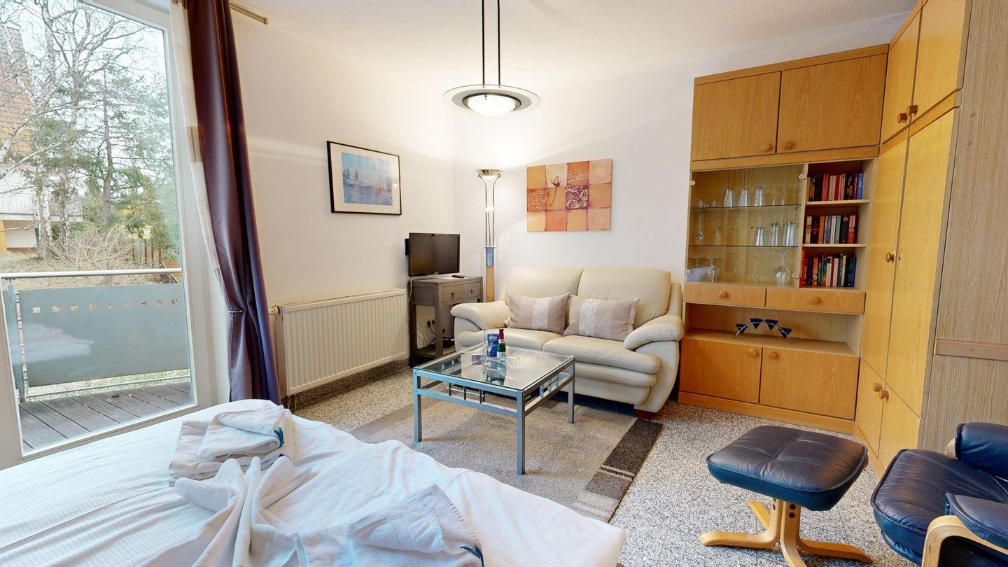 * Wohnzimmer: Couchgarnitur und 2 Sessel, Schrankbett, Kabel-TV, WLAN und Zugang zum Balkon