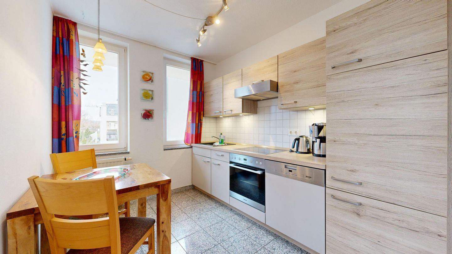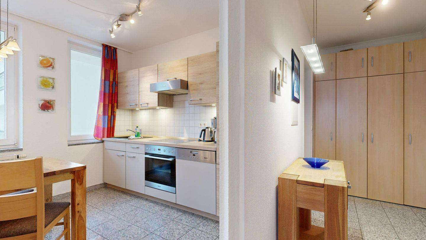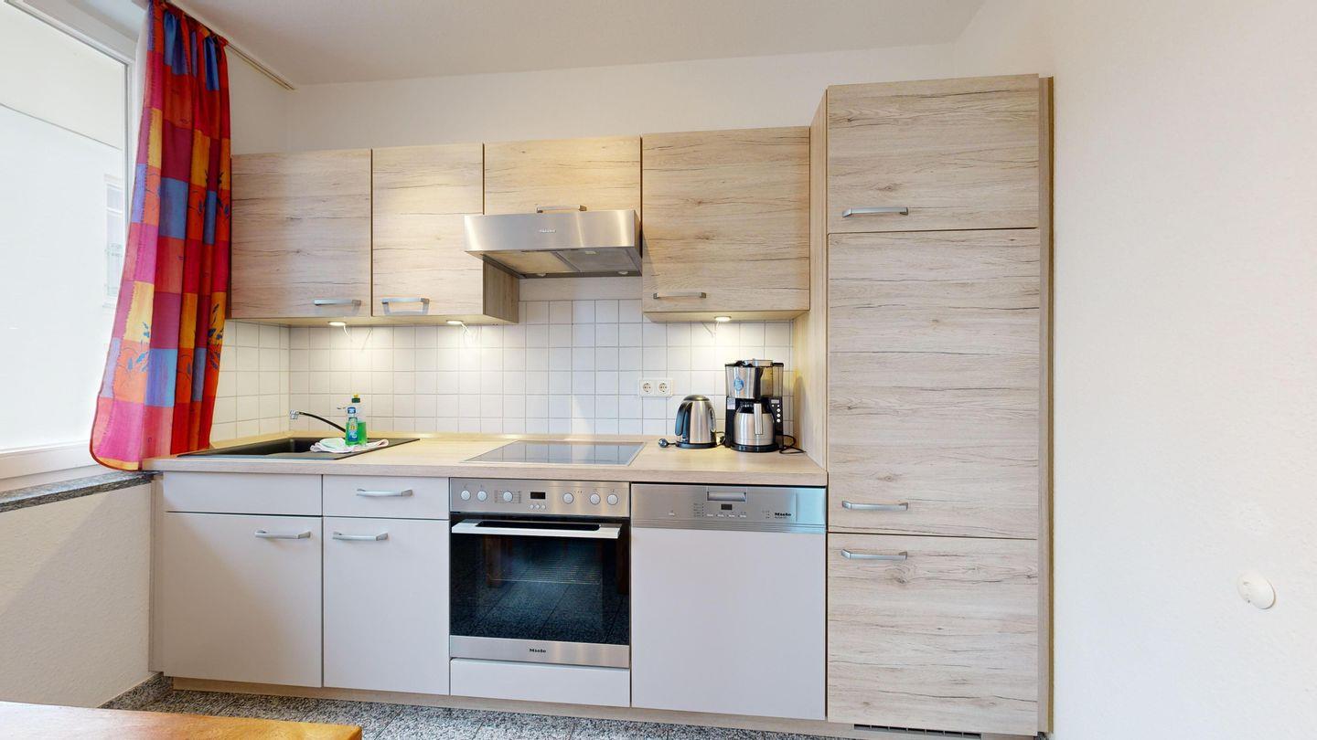 * Küche mit Essplatz, E-Herd und Backofen, Kühlschrank, Spülmaschine, Kaffeemaschine, Wasserkocher und Toaster