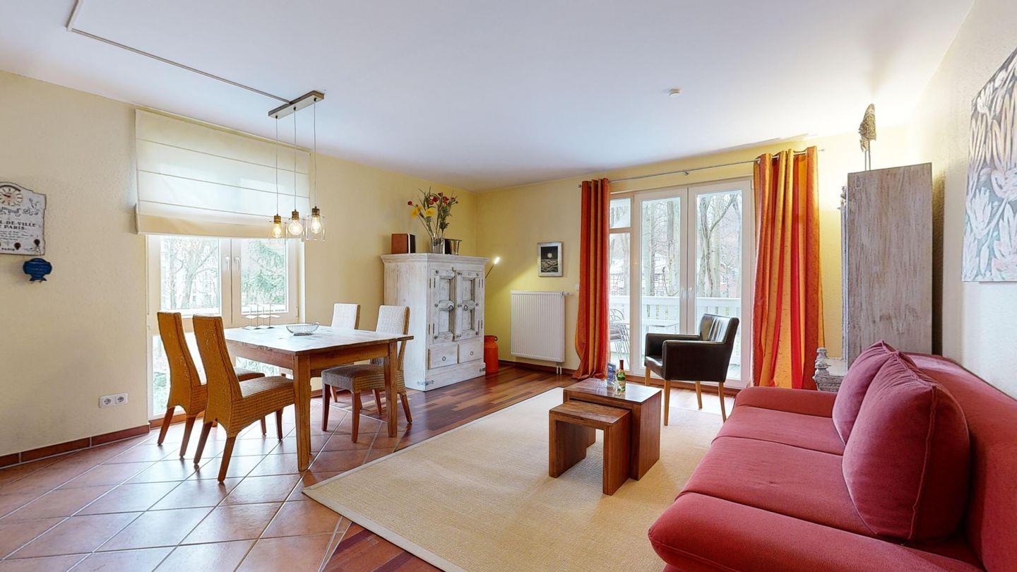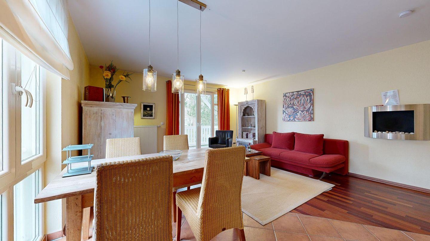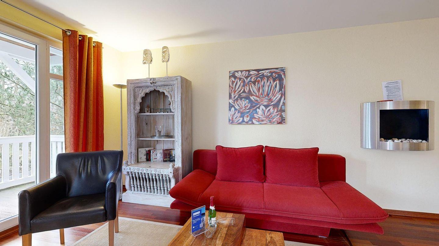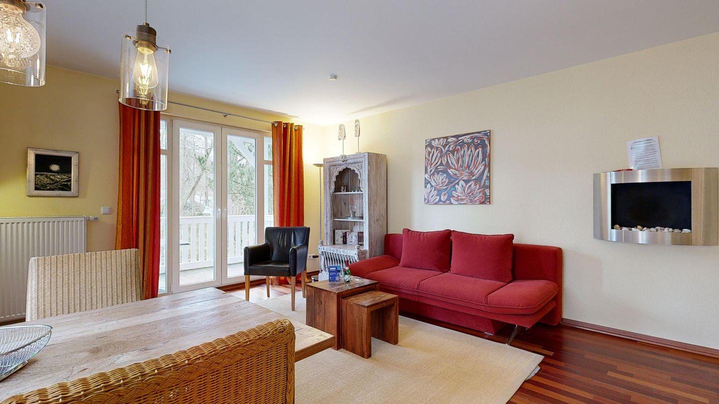 * Wohnzimmer: Kabel-TV, DVD-Player, Stereoanlage, Kamin (Edelstahl-Wandkamin), der mit Bio-Ethanol betrieben wird, WLAN-Internetanschluss und Essplatz