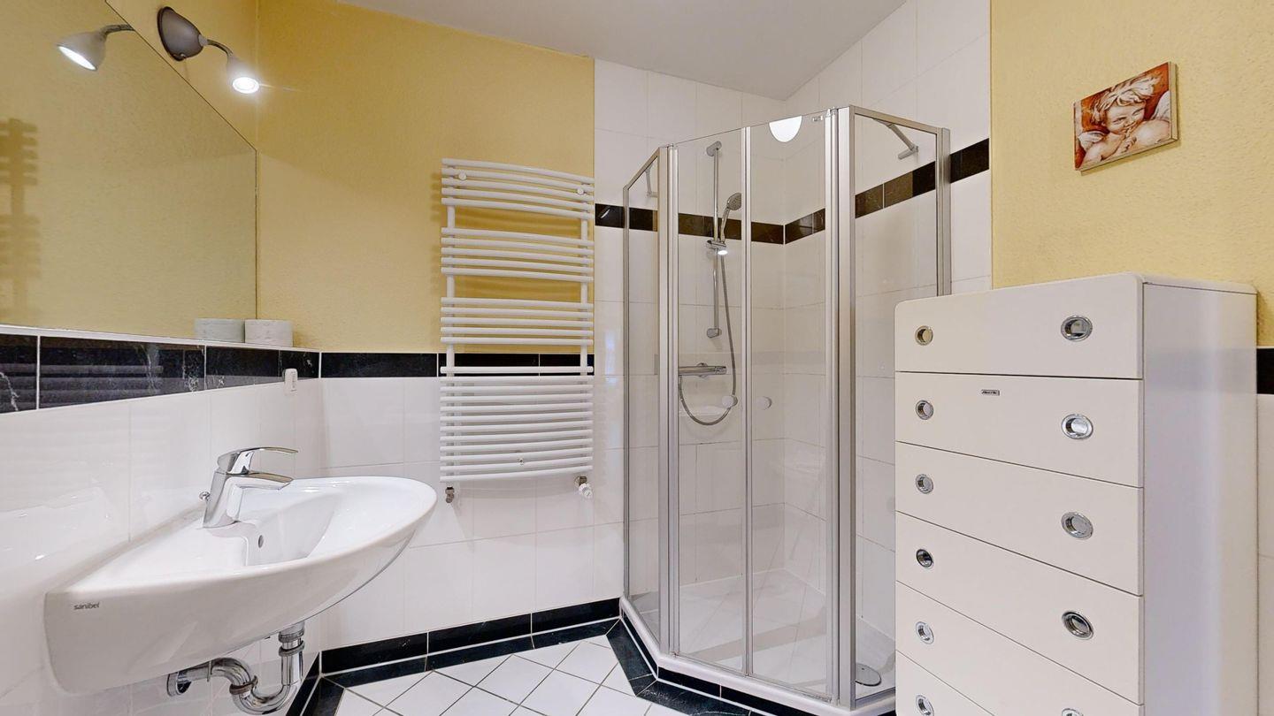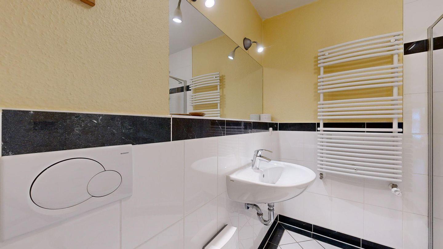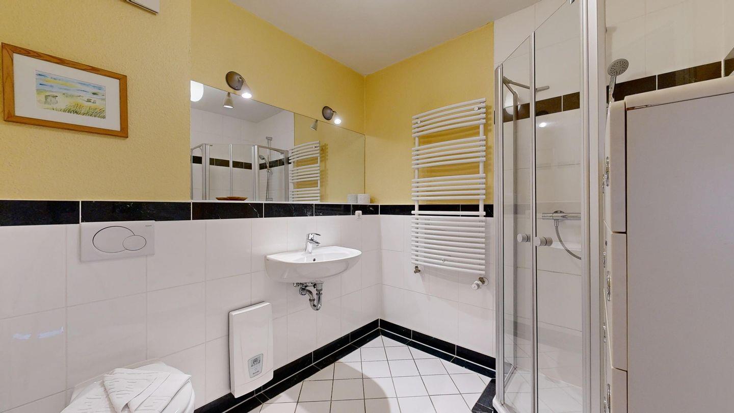 * Badezimmer mit Dusche, WC und Föhn