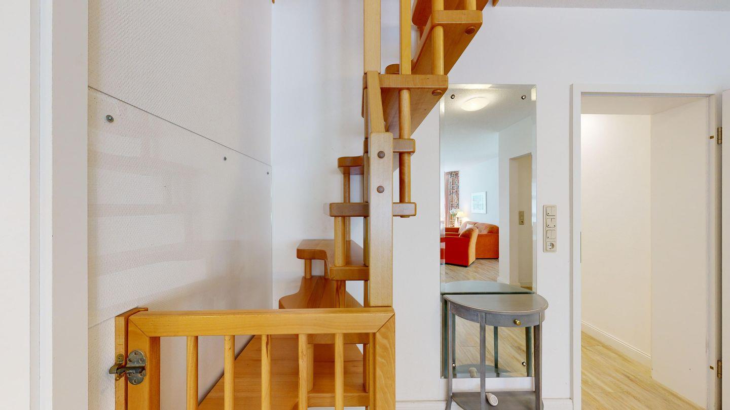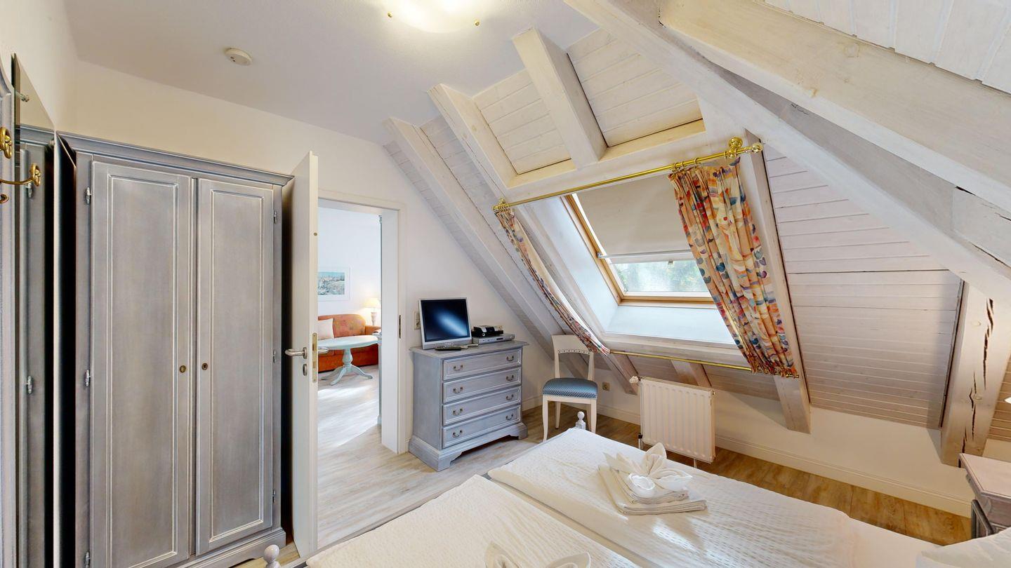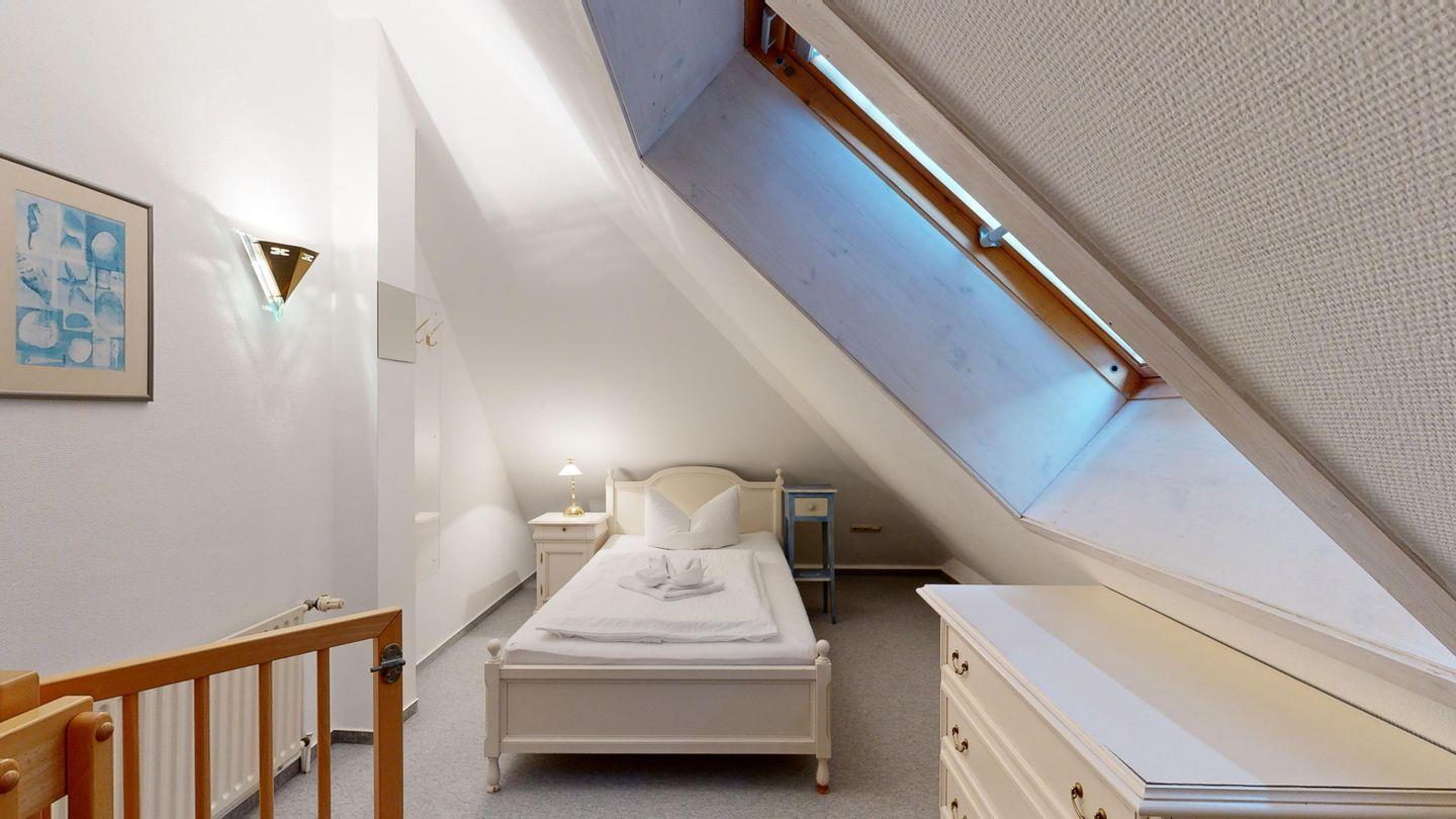 * Durch eine schmale und steile Treppe, oben und unten durch ein Treppengitter gesichert, gelangen Sie ins Dachgeschoss, wo sich ein weiteres Zimmer (offener Zugang / leichte Schrägen) mit einem Einzelbett befindet.