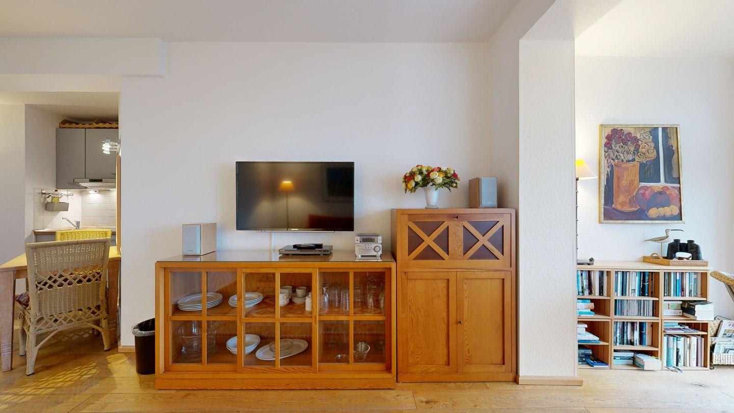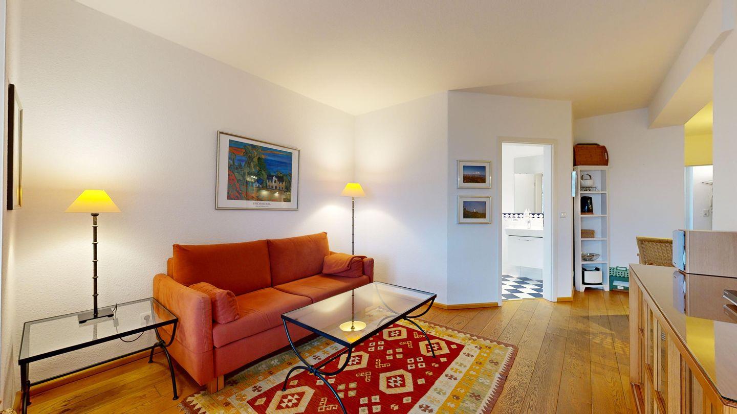 * Wohnzimmer: Couchgarnitur, Kabel-TV, Radio mit CD, DVD-Player, freier WLAN-Anschluss, Essplatz