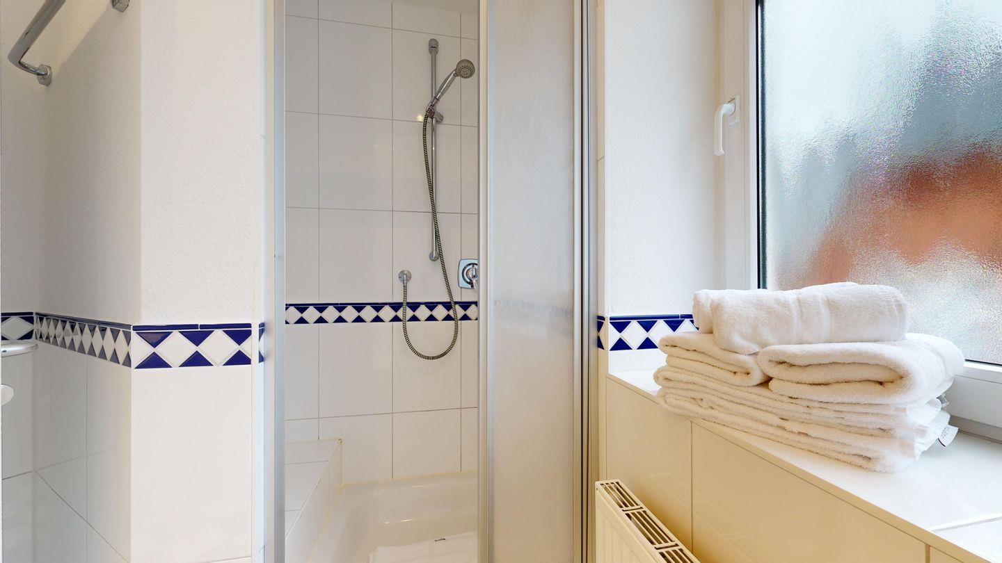 * 1 Badezimmer mit Dusche, WC und Föhn