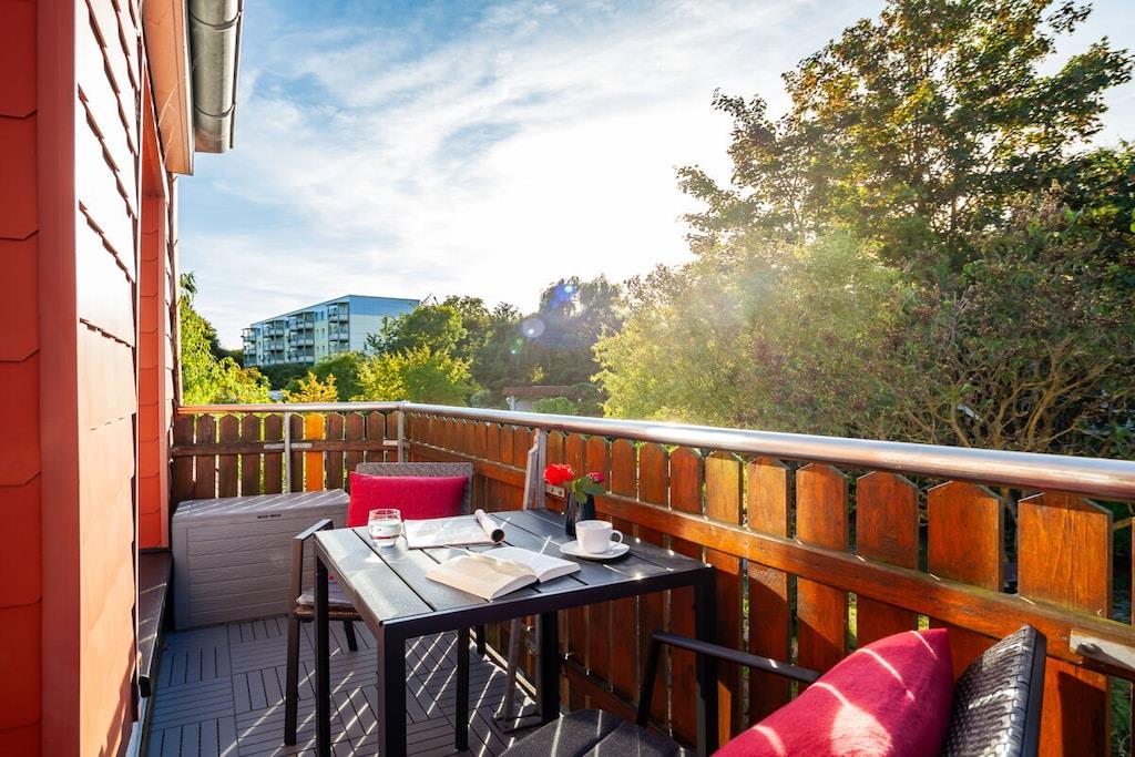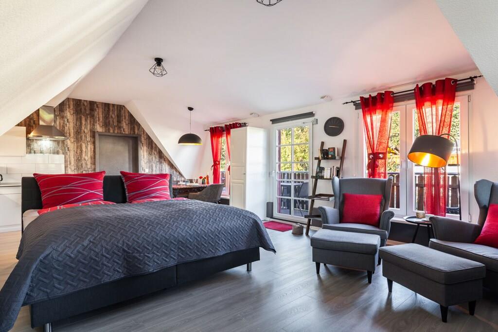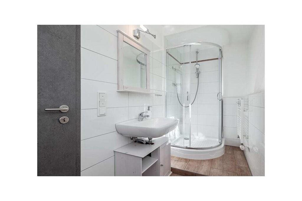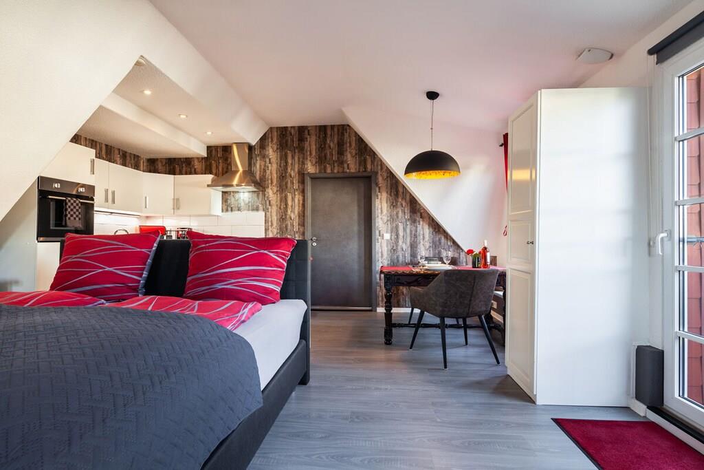 Vores ferielejlighed er en hyggelig etværelseslejlighed med balkon på første sal til op til to personer. Opholdsstuen har laminatgulv og en komfortabel boxmadras til to personer (180x200 cm). Det fuldt udstyrede køkken er integreret i opholdsstuen. Det indeholder et køleskab med frostboks, et komfur med ovn, en mikrobølgeovn og en opvaskemaskine. Lejligheden har selvfølgelig også et separat brusebad. En parkeringsplads på vores grund sikrer sikker parkering af din bil. Du kan også sikkert opbevare dine egne cykler, såsom elcykler, i vores overdækkede cykelskur.