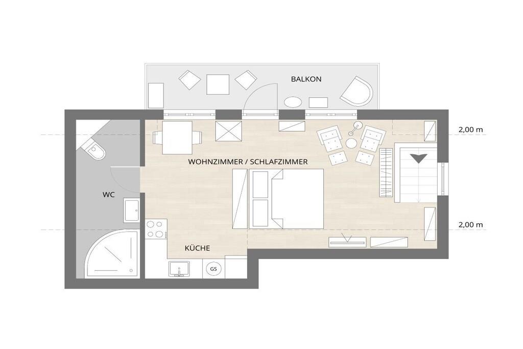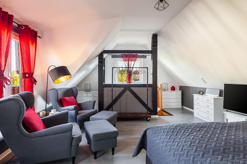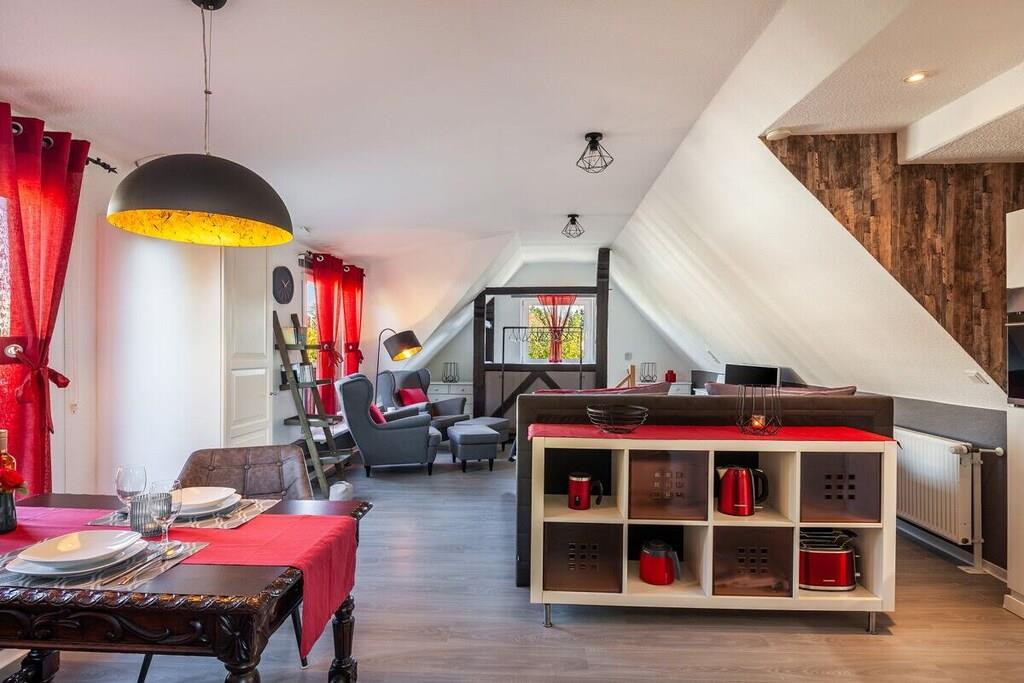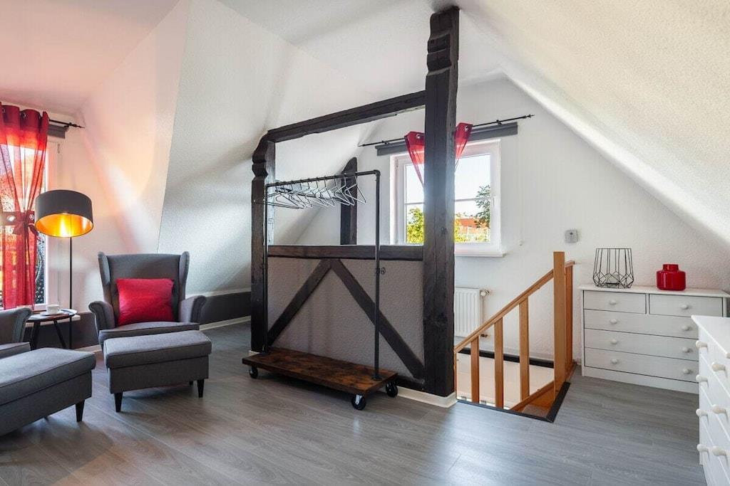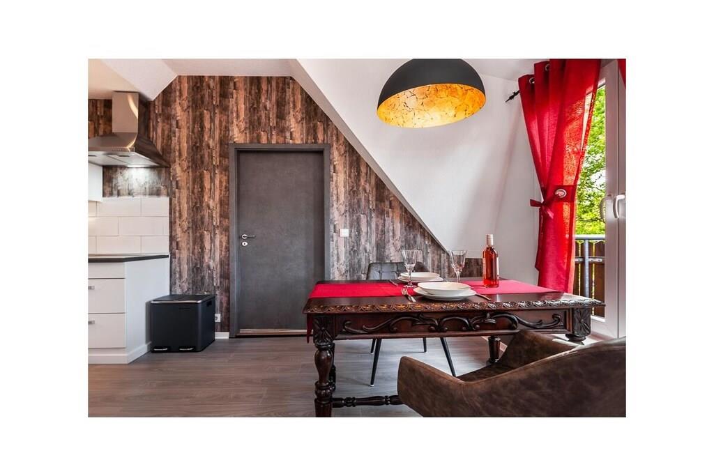 Vores ferielejlighed er en hyggelig etværelseslejlighed med balkon på første sal til op til to personer. Opholdsstuen har laminatgulv og en komfortabel boxmadras til to personer (180x200 cm). Det fuldt udstyrede køkken er integreret i opholdsstuen. Det indeholder et køleskab med frostboks, et komfur med ovn, en mikrobølgeovn og en opvaskemaskine. Lejligheden har selvfølgelig også et separat brusebad. En parkeringsplads på vores grund sikrer sikker parkering af din bil. Du kan også sikkert opbevare dine egne cykler, såsom elcykler, i vores overdækkede cykelskur.