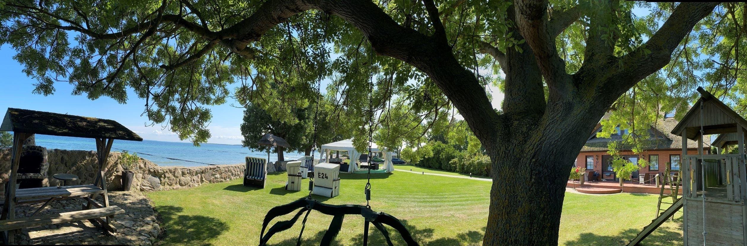 Besonders erholungssuchende Paare und Familien werden die Großzügigkeit unseres Grundstückes zu schätzen wissen. Auf unseren 2000qm großem Gartengrundstück finden Sie alles um einen ungestörten Strandtag zu verbringen. Die Lounge Terasse lädt schon am morgen zu einem aussergewöhnlichen Frühstück mit 180 Grad Meerblick ein. Jede Wohnung hat im Gartenbereich ihren eigenen Strandkorb und im Loungebereich mit Gartenkamin findet man auch jederzeit ein beschauliches Plätzchen. Eine Natursteinmauer mit eingebautem Gartenkamin begrenzt das Grundstück hin zum Strand und sorgt so für eine angenehme ungestörte Ruhe.