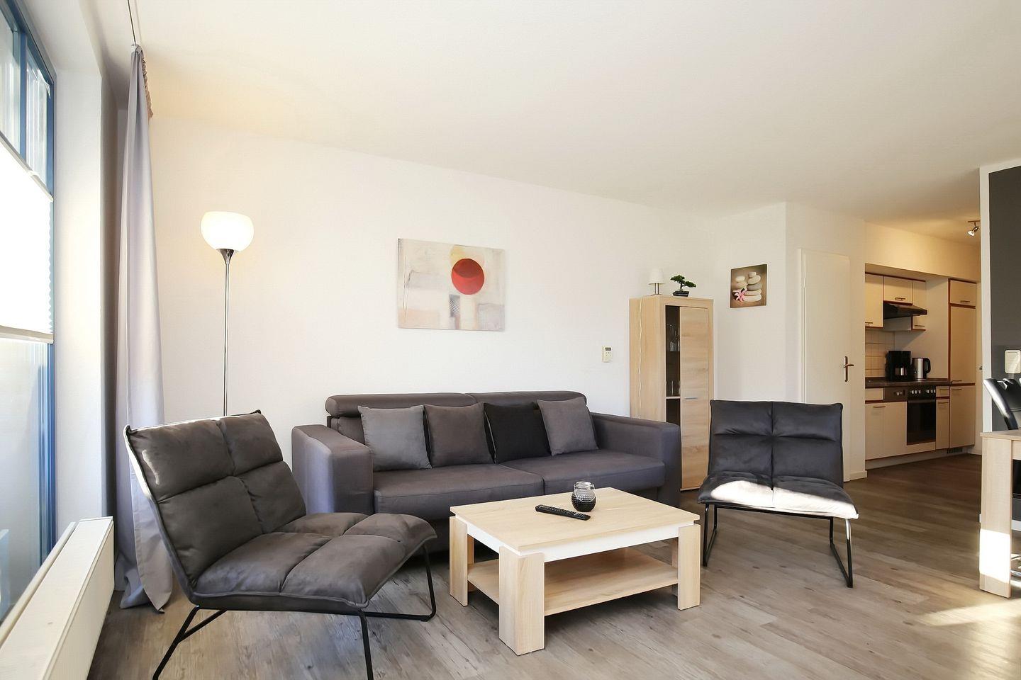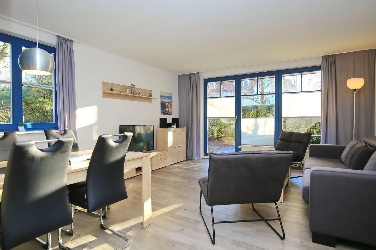Das 2-Zi.-Appartement liegt im Erdgeschoss und hat eine Terrasse in südlicher Lage. Es bietet mit ca. 55 m² für bis zu 4 Personen ausreichend Platz für erholsame Urlaubstage. Dich erwartet ein Wohn- Essbereich, ein Schlafzimmer, eine Küchenzeile und ein Duschbad. Die Strandentfernung beträgt von der Ferienanlage Papillon ca. 250 m.