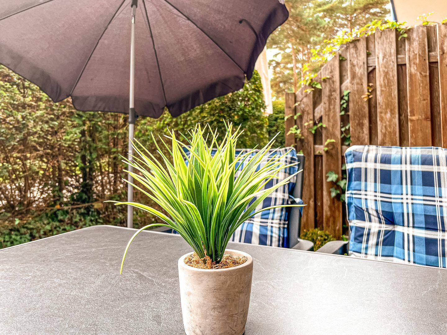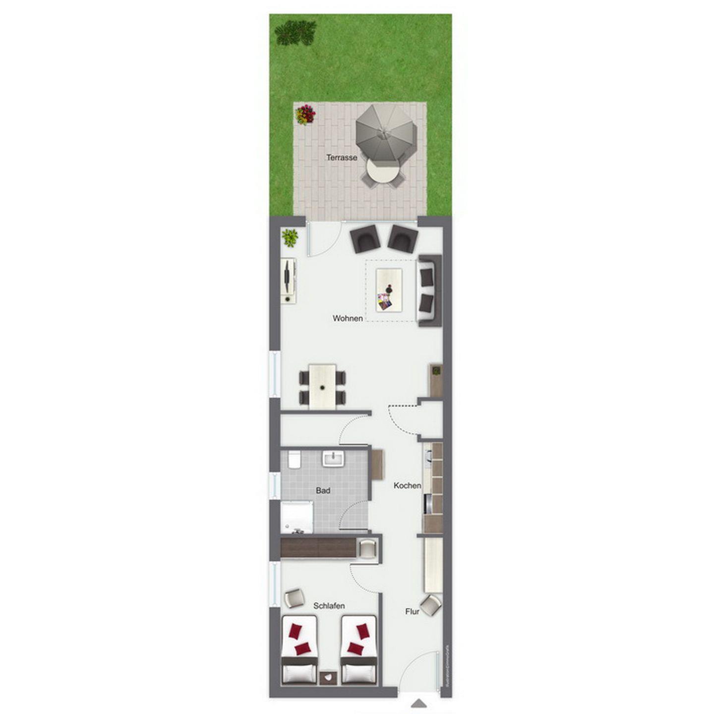 Die sonnige Terrasse ist möbliert und lädt zum entspannenden Aufenthalt im Freien ein. Dein Wohnzimmer ist mit einer Doppelschlafcouch (140 x 195 cm) eingerichtet. An einem großen Esstisch könnt ihr die gemeinsamen Mahlzeiten einnehmen. Für Unterhaltung sorgen Flachbild-TV, DVD-Player, Stereoanlage und eine Auswahl an Spielen und Büchern.