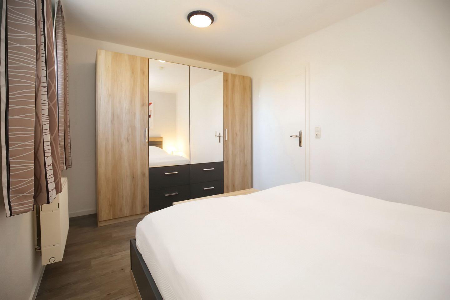 Im Schlafzimmer stehen dir ein Doppelbett (2 x 80 x 200 cm) und ein geräumiger Kleiderschrank zur Verfügung. Die Fenster werden mit Rollos abgedunkelt.