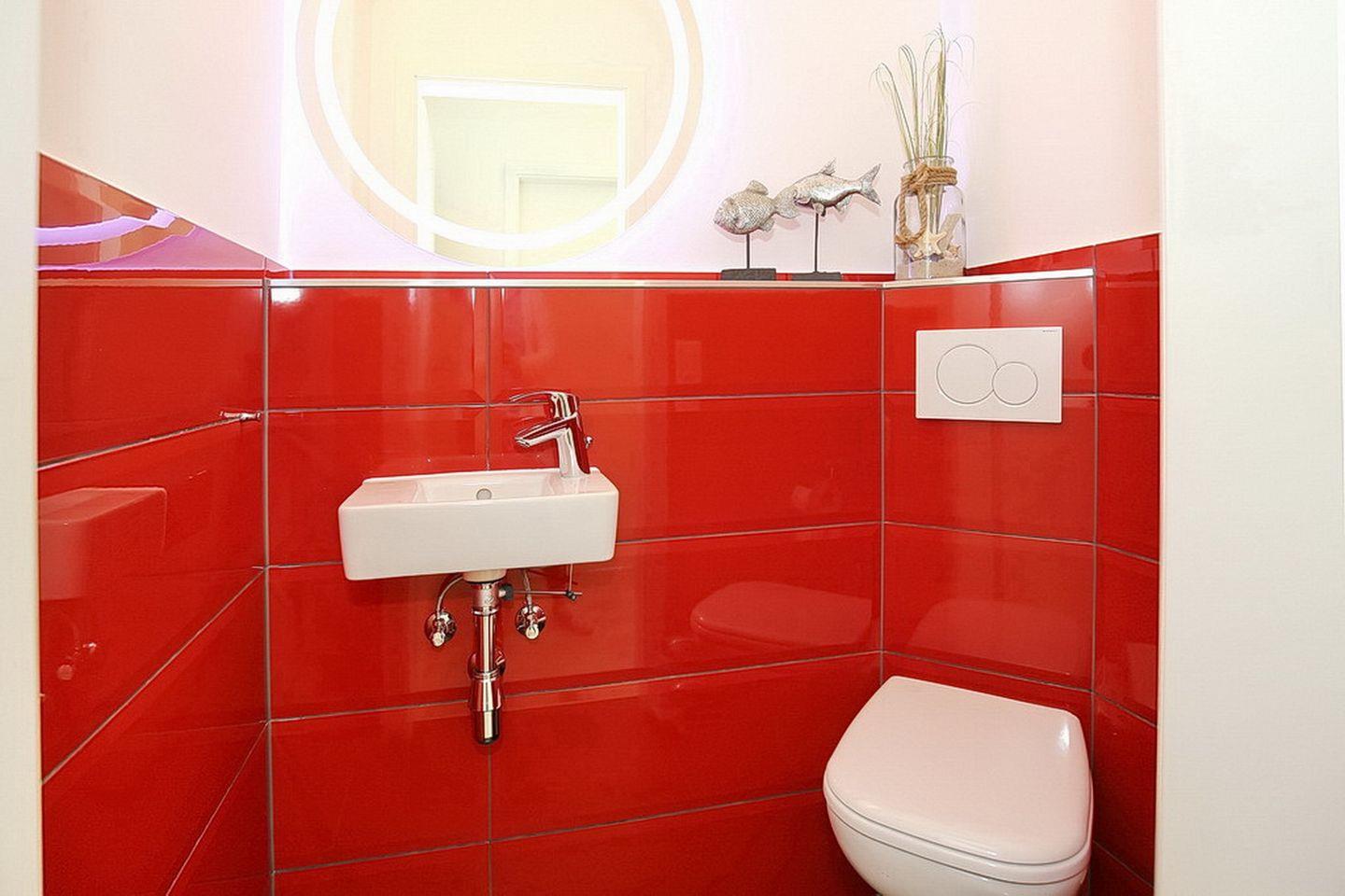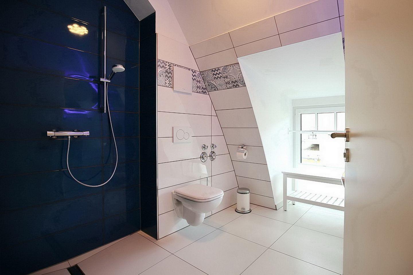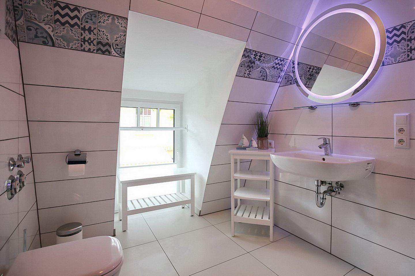 Das stilvolle Bad ist hell gefliest und mit einem Waschtisch, einer bodengleichen Dusche, einem WC sowie einem Handtuchheizkörper ausgestattet. Zusätzlich ist ein Gäste-WC vorhanden.