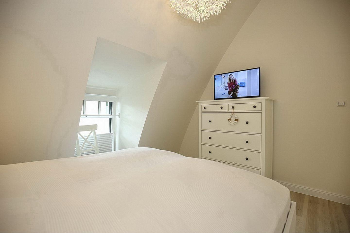 Über den Flur erreichst du das Schlafzimmer. Ein komfortables Doppelbett (2 x 80 x 200 cm) verspricht erholsamen Schlaf. Deine Urlaubsgarderobe findet in dem geräumigen Kleiderschrank viel Platz. Ein zweiter Fernseher steht ebenfalls zur Verfügung. Selbstverständlich können die Fenster durch Plissees verdunkelt werden.