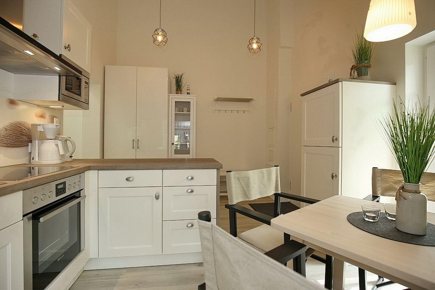 Direkt vom Hausflur gelangst du in die moderne Küche. Hier findest du alles, was du für die Zubereitung der Mahlzeiten benötigst. Dazu zählen eine Mikrowelle, ein Herd mit 4 Cerankochfeldern sowie Backofen, ein Kühlschrank mit Gefrierfach, eine Geschirrspülmaschine, ausreichend Geschirr und Gläser. Die gemütliche Essecke bietet Platz und Komfort für kulinarische Freuden. Auf dem Südbalkon kannst du den Sonnenuntergang genießen. Den Balkon erreichst du von der Küche aus. Auf ihm kannst du den vorhandenen Elektrogrill (Tischgrill) nutzen.