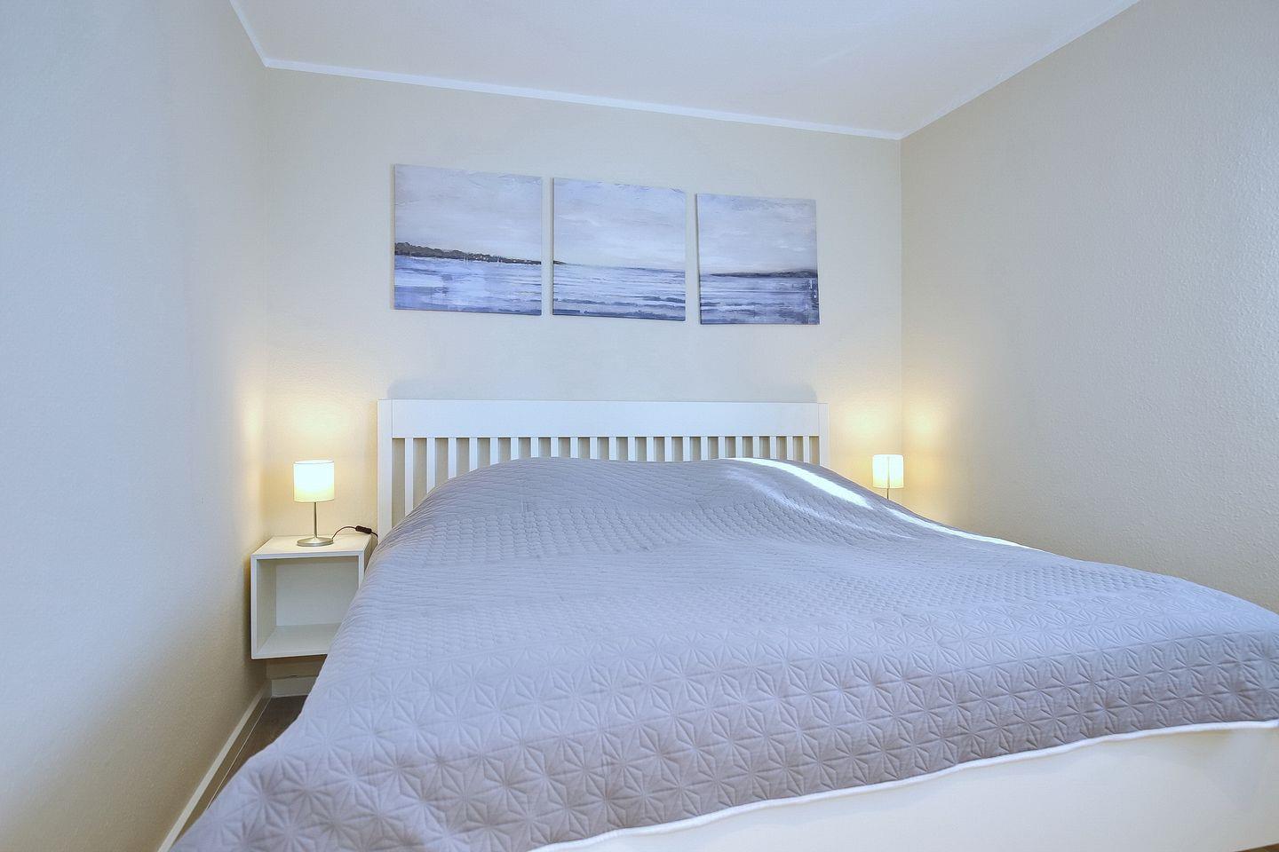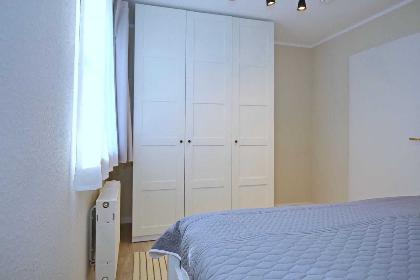 Im Schlafzimmer findest du ein Doppelbett (180 x 200 cm) und einen geräumigen Kleiderschrank vor. Das Fenster wird mit einem Vorhang verdunkelt. Eine Kommode auf dem Flur bietet weitere Ablagemöglichkeiten für deine mitgebrachte Garderobe.