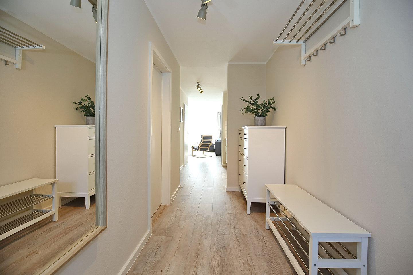 Die Küchenzeile ist mit einem Geschirrspüler, einem Backofen, einem 4-Platten-Cerankochfeld und einem Kühlschrank mit Gefrierfach ausgestattet. Die gesamte Wohnung ist mit Designboden ausgelegt.