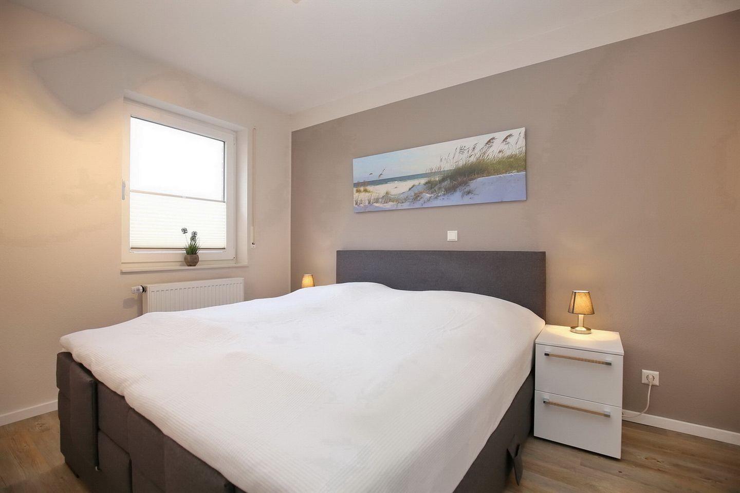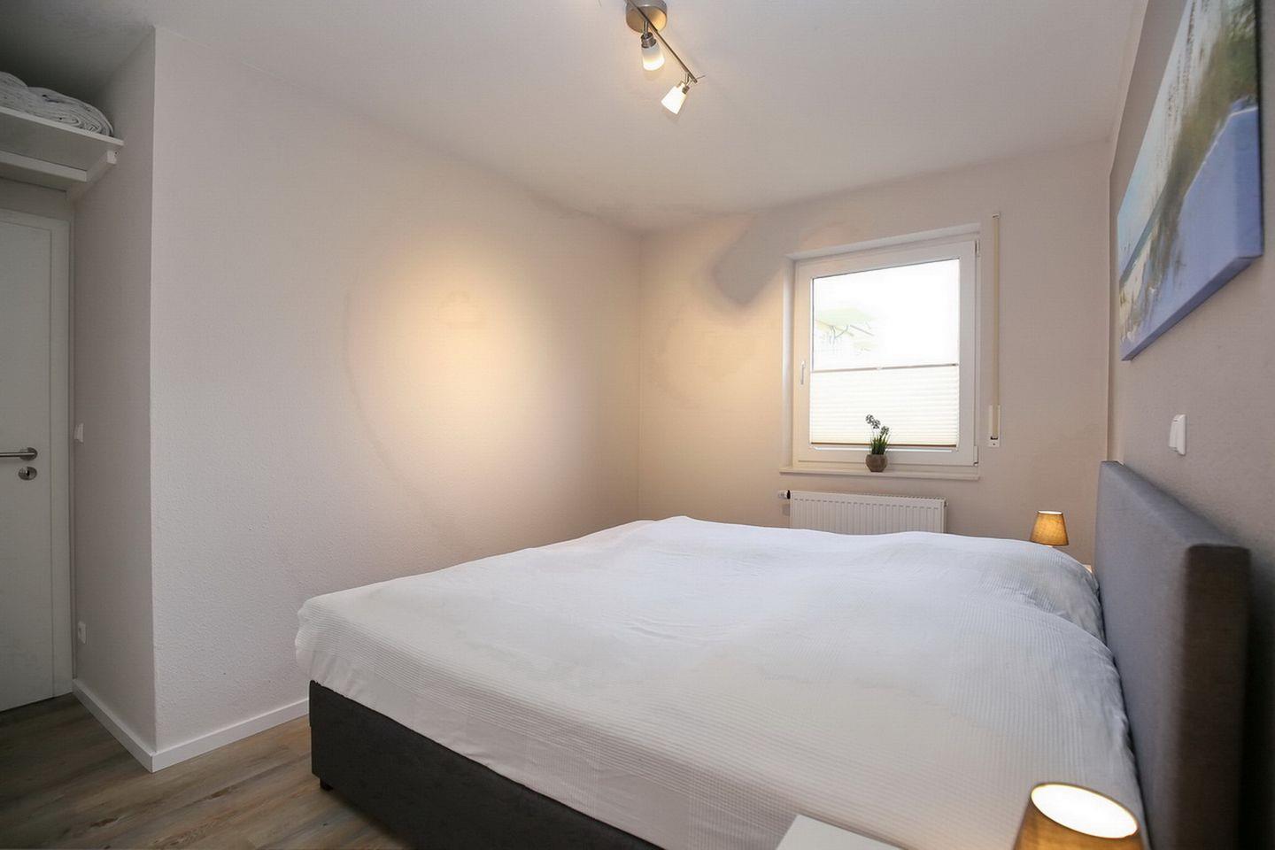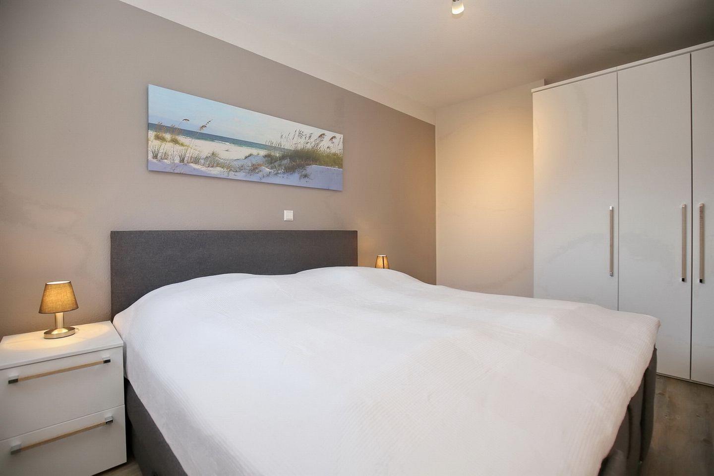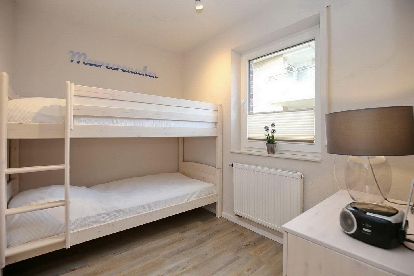 Im Schlafzimmer schläfst du im komfortablen Doppelbett (180 x 200 cm) mit geteiltem Topper. Der großzügige Kleiderschrank bietet genügend Platz für deine Urlaubsgarderobe. Für deinen Schlafkomfort wurden Außenjalousien zum Verdunkeln angebracht. Das 2. Schlafzimmer der Ferienwohnung hat ein Etagenbett (90x200 cm). Im Kleiderschrank hast du Platz für weitere Urlaubsgarderobe. Für die kleinen Gäste stehen ein Kinderreisebett und ein Kinderhochstuhl kostenfrei zur Verfügung.