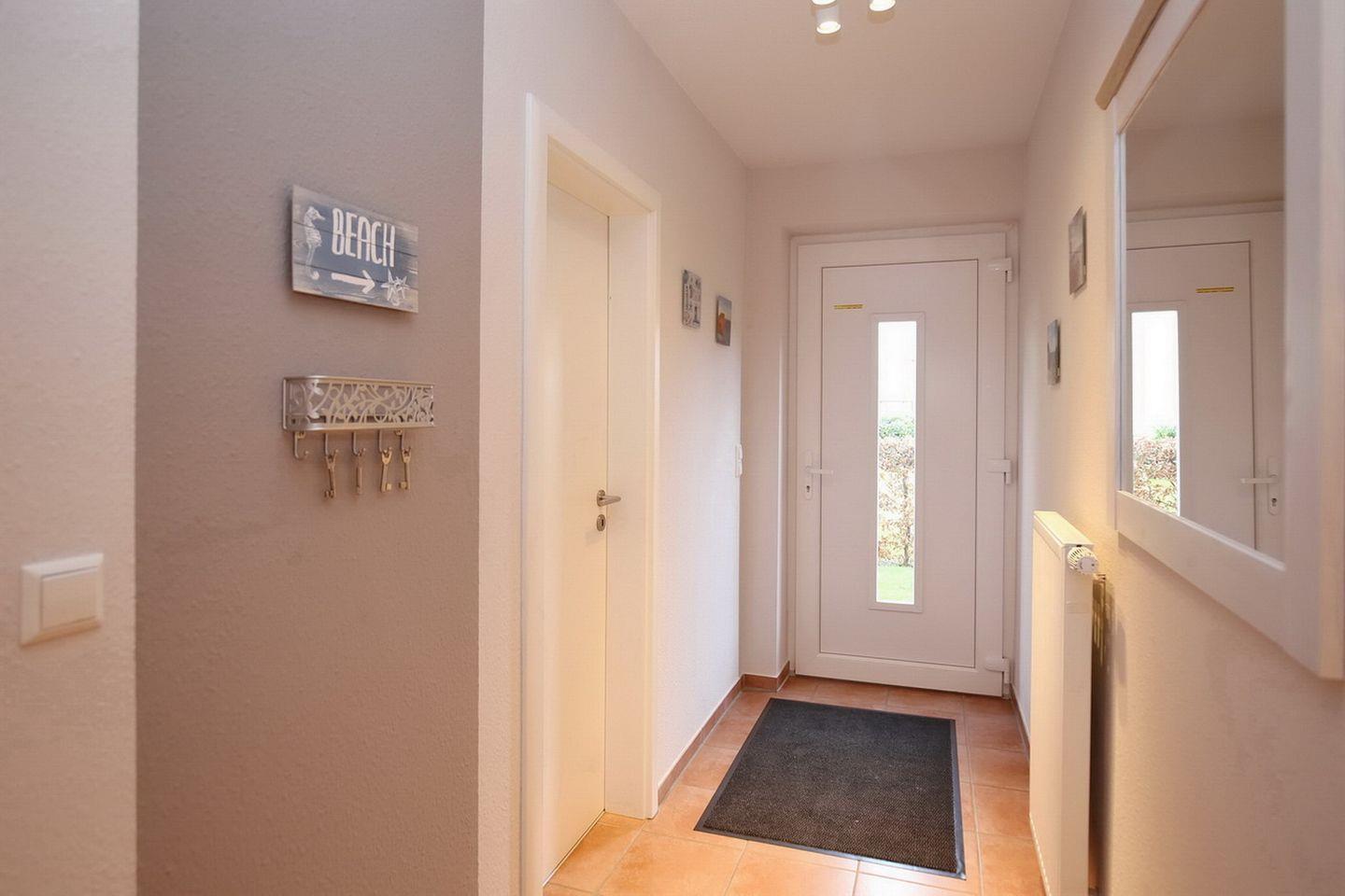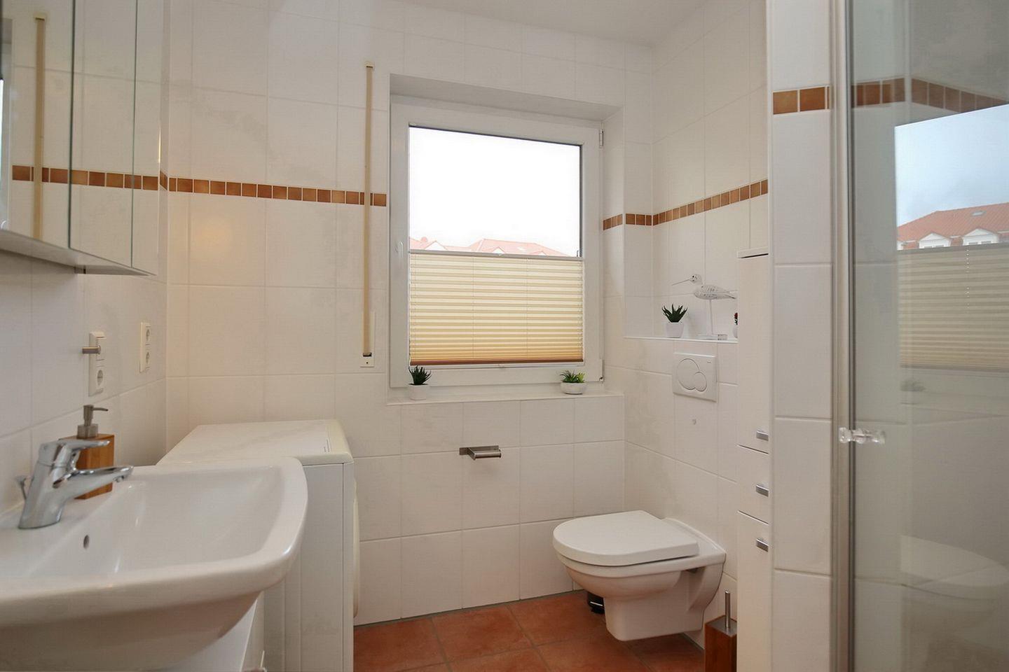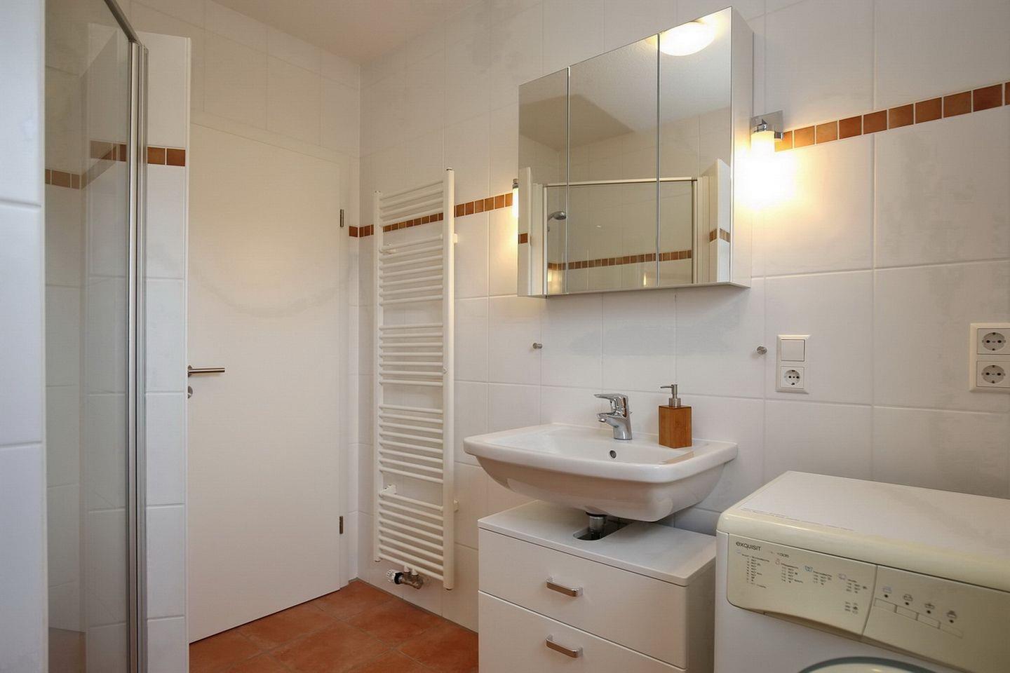 Das helle Duschbad ist geräumig und hat eine bodengleiche Dusche. Am großzügigen Waschtisch findest du genügend Platz für deine Kosmetikartikel. Falls du im Urlaub waschen möchtest, findest du direkt im Bad die Waschmaschine (1 Waschgang 4 x 1,-€ Münze).