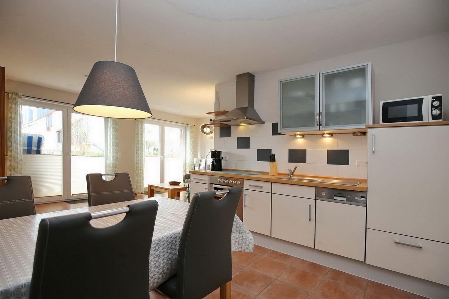 Dank der gut ausgestatteten Küchenzeile kannst du deine Lieblingsmahlzeiten auch im Urlaub gerne zubereiten. Die moderne Einbauküche hat: eine Mikrowelle, einen Herd mit einem 4-Platten-Cerankochfeld und Backofen, einen Kühlschrank mit Gefrierfach, eine Geschirrspülmaschine, ausreichend Geschirr und Gläser, Toaster, Kaffeemaschine und Wasserkocher. Serviere einfach im Essbereich gegenüber der Küchenzeile deine Mahlzeiten und genieße deine gemeinsame Urlaubszeit.
