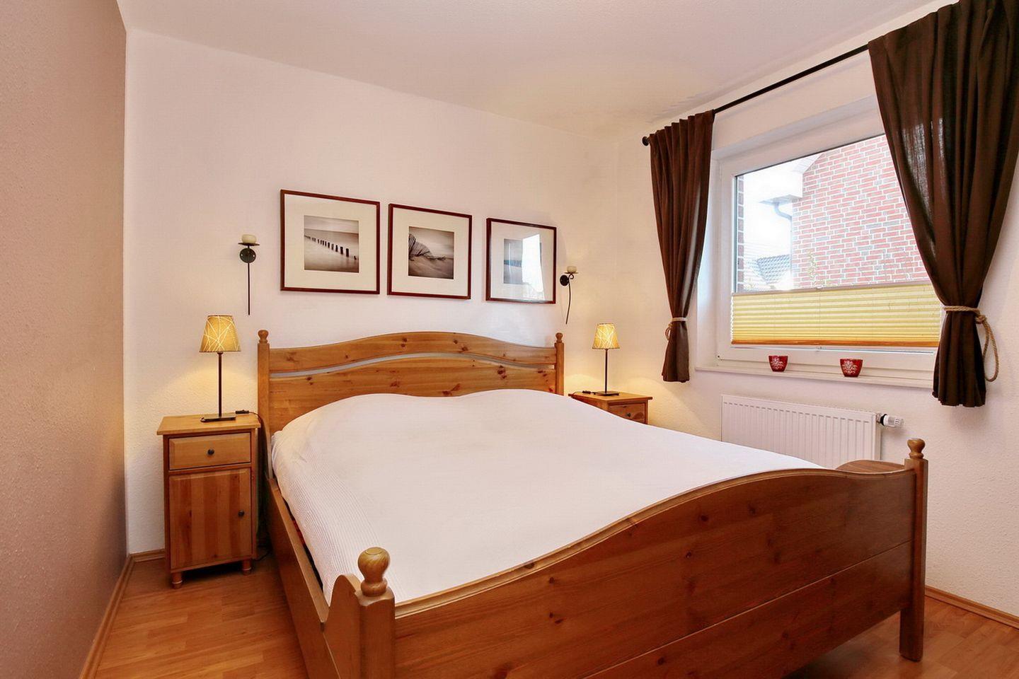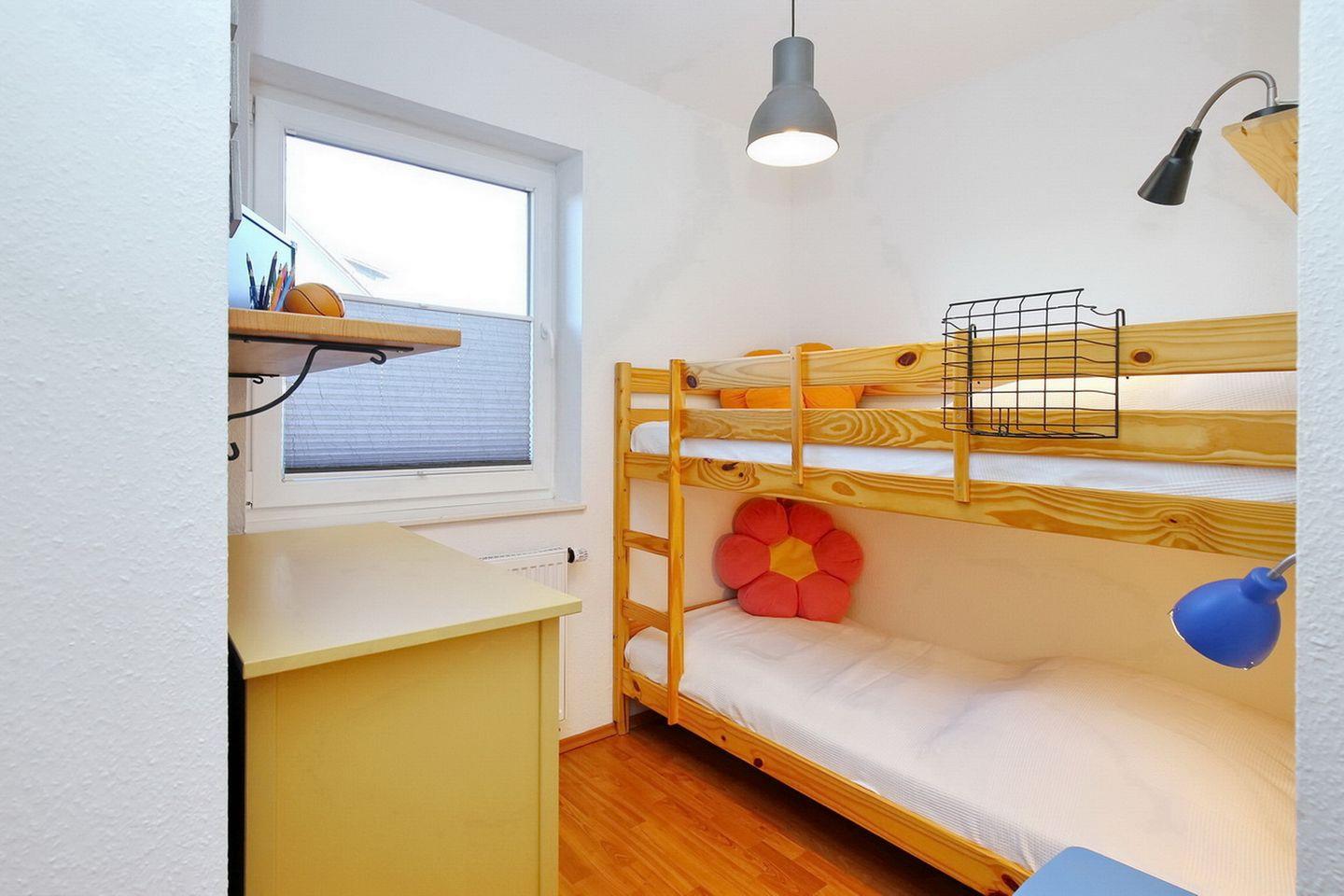 Im großen Schlafzimmer steht ein Doppelbett (2 x 90 x 200 cm). Im großen Kleiderschrank findest du genügend Stauraum für deine Garderobe. Das 2. Schlafzimmer der Ferienwohnung hat ein Etagenbett (90 x 190 cm) und eine Kommode. Für deinen Schlafkomfort wurden Außenjalousien zum Verdunkeln angebracht.