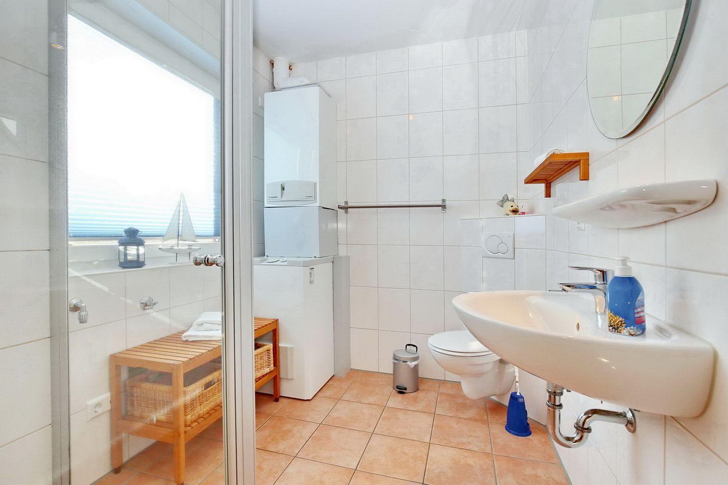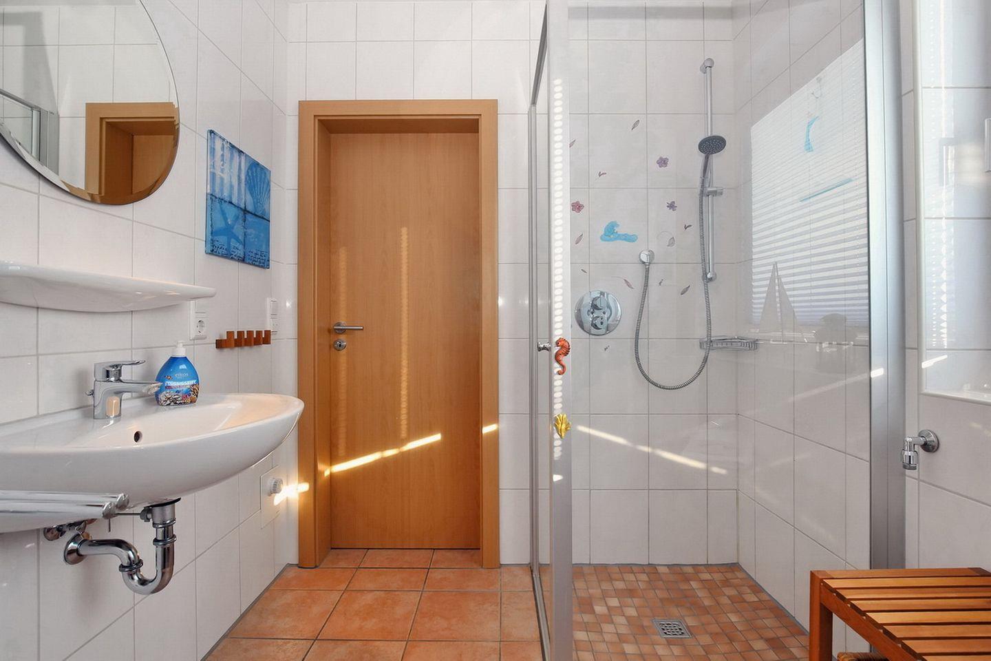 Im geräumigen Duschbad mit Fußbodenheizung erreichst du bequem die bodengleiche Dusche. Am Waschtisch findest du Platz für deine Kosmetik.