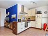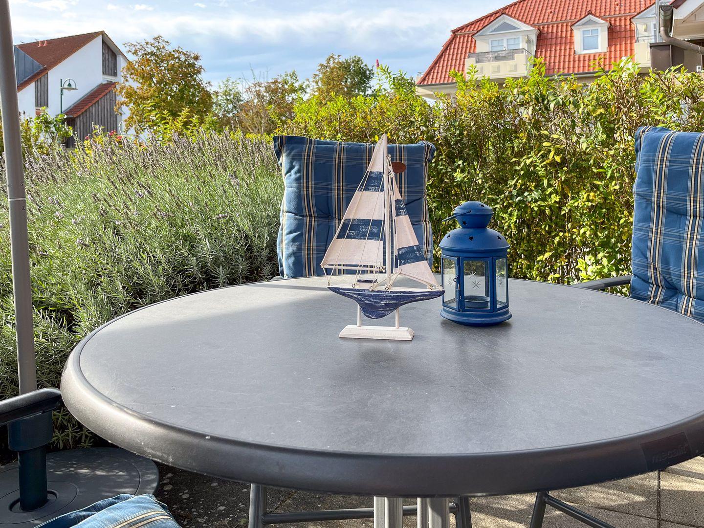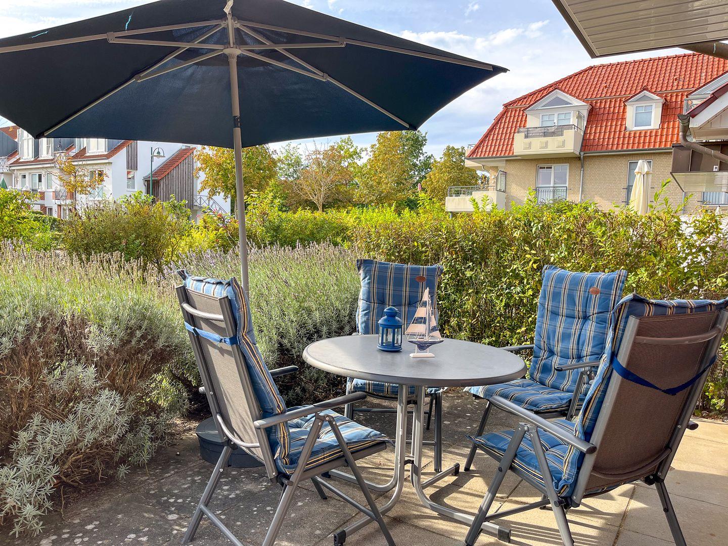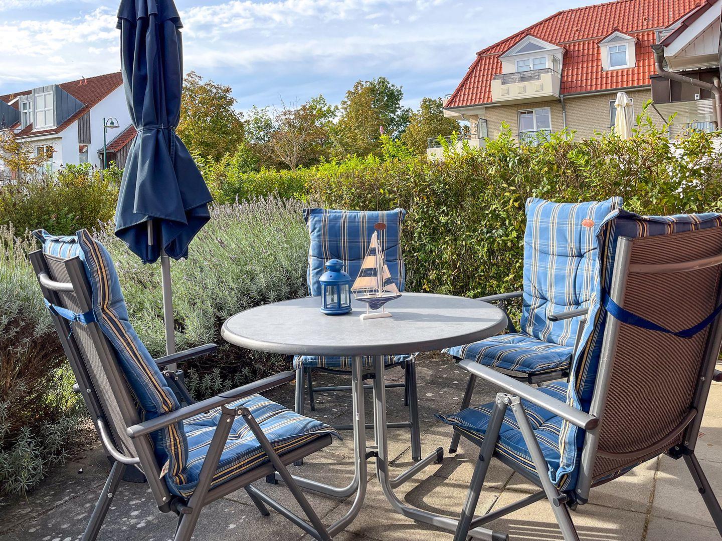 Der Mittelpunkt der modernen Ferienwohnung ist der offene Wohnbereich mit Küche und Essplatz. Dank der großen Terrassenfenster ist der Raum lichtdurchflutet und hell. Er lässt sich jedoch bei Bedarf mit den Außenjalousien oder den Vorhängen verdunkeln. Vom Wohnbereich aus gelangst du bequem auf die Terrasse. Hier findest du während der Saison Terrassenmöbel und einen Sonnenschirm.