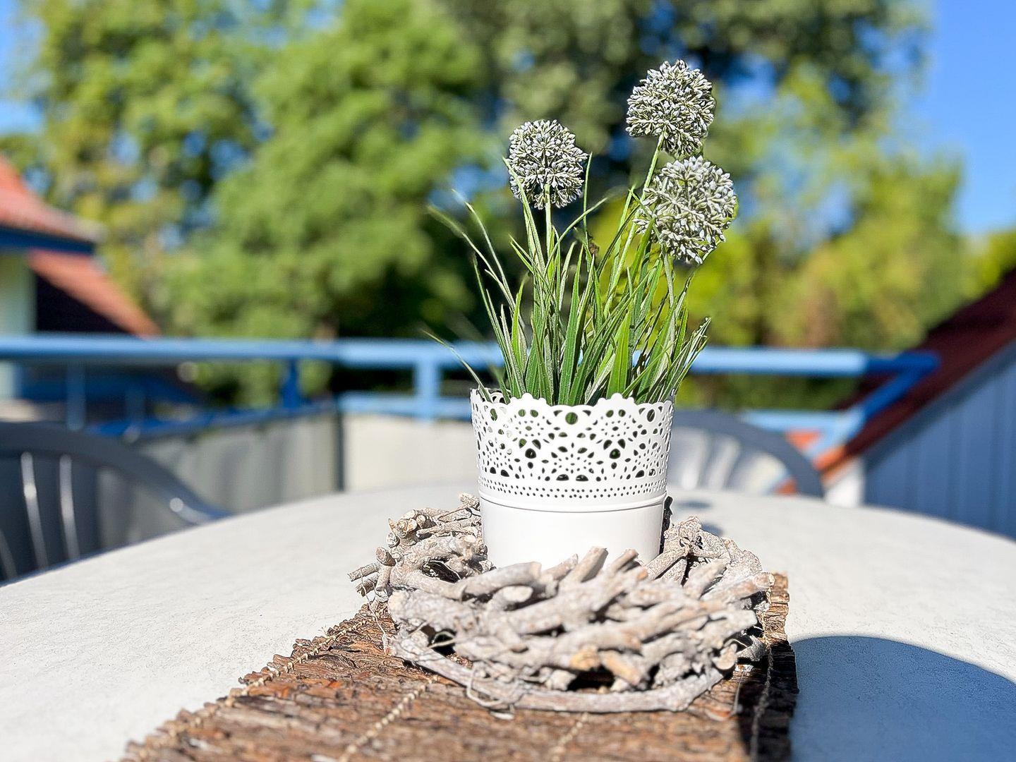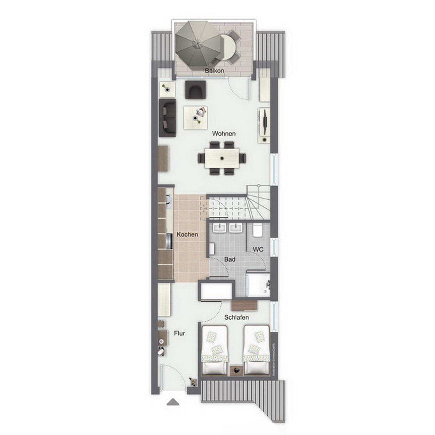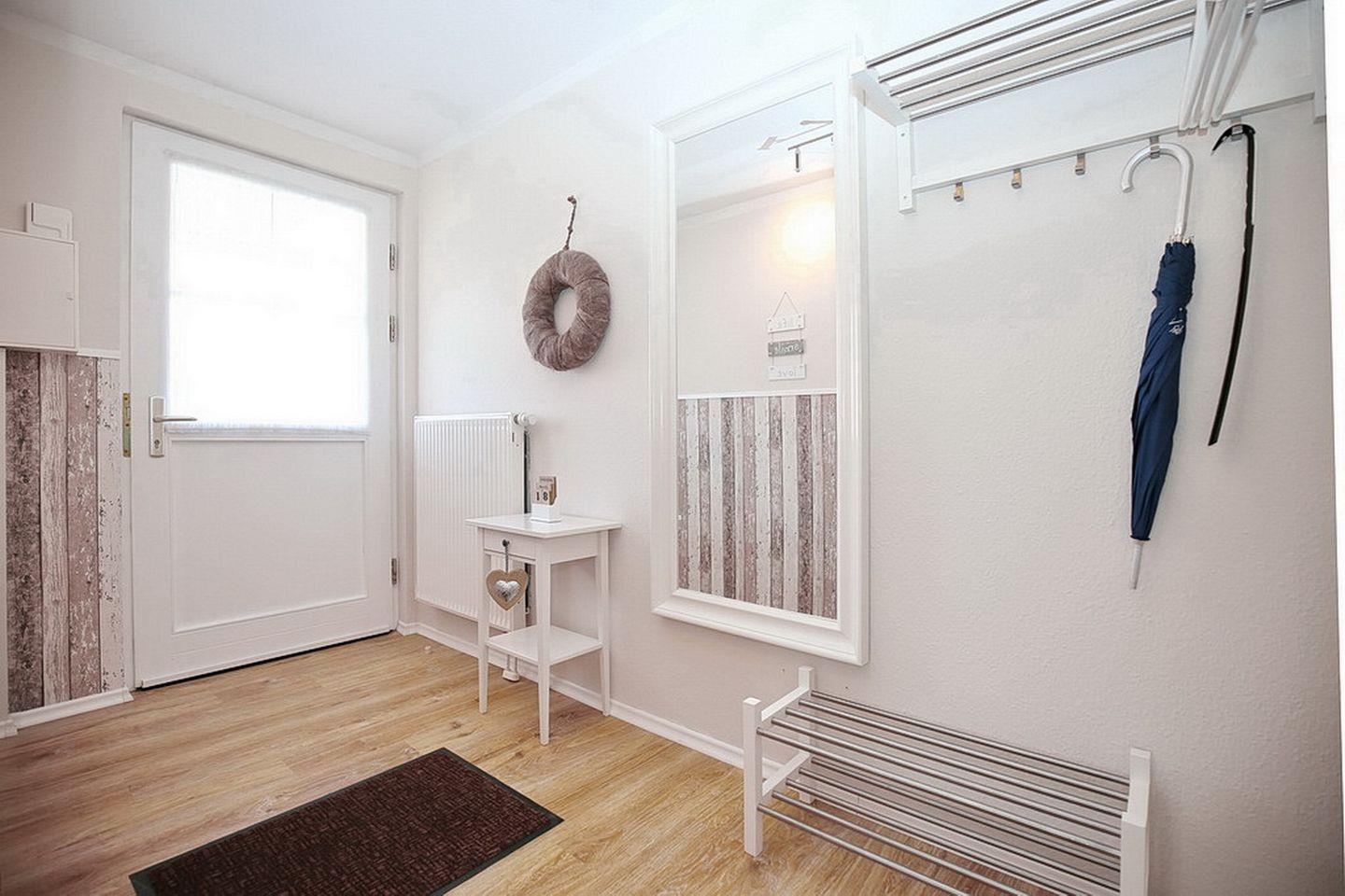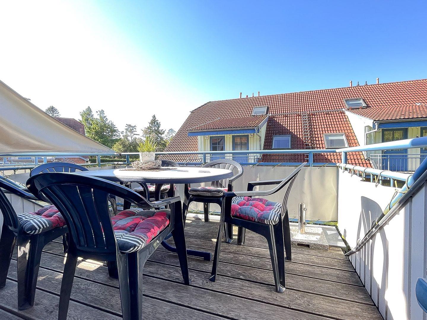 Das geschmackvoll eingerichtete 4-Zimmer-Ferienwohnung mit einem möblierten Balkon in Süd-West Lage liegt im 1. OG am Ende des Hauses und ist über eine Außentreppe zu erreichen. Die Wohnung mit ca. 68 m² Wohnfläche verläuft über zwei Etagen und verfügt über einen Wohn- und Essbereich, drei Schlafzimmer, ein Küchenzeile und ein Duschbad. Die Entfernung zum Strand beträgt von der Ferienanlage Papillon nur etwa 250 m.