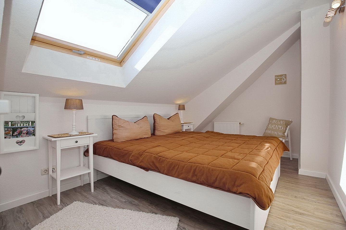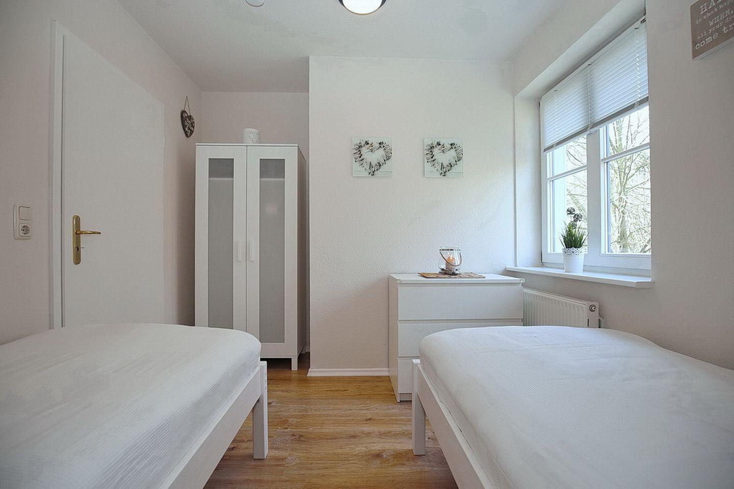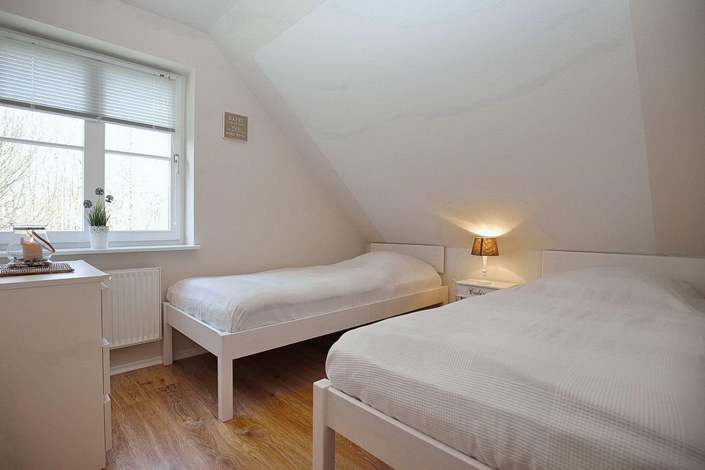 In deinem Schlafzimmer im 1. OG findest du neben zwei Einzelbetten (2 x 90 x 200 cm) auch einen Kleiderschrank vor. Beide Schlafzimmer im Dachgeschoss sind mit jeweils einem Doppelbett (2 x 90 x 200 cm und 2 x 80 x 200 cm) und einem Kleiderschrank eingerichtet. In einem Schlafzimmer befindet sich an dem Fenster ein Rollo zur Verdunkelung. An den anderen ein lichtdurchlässiges Plissee. Der Bodenbelag im 1. OG ist Laminat. Das Dachgeschoss ist mit Laminat ausgelegt.