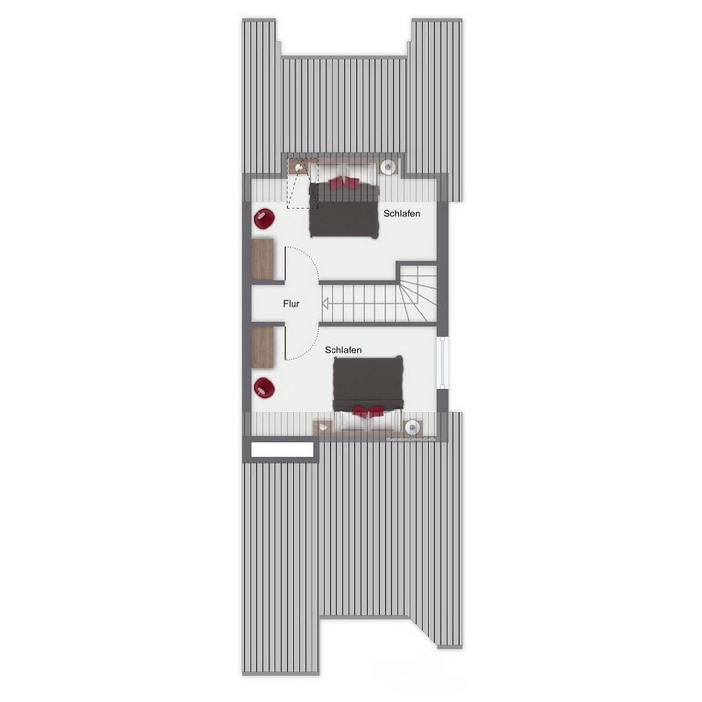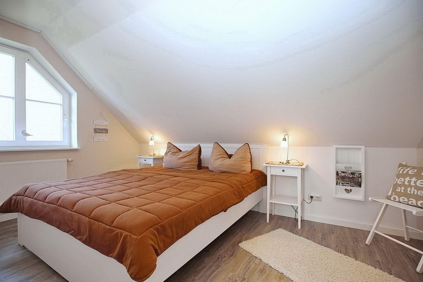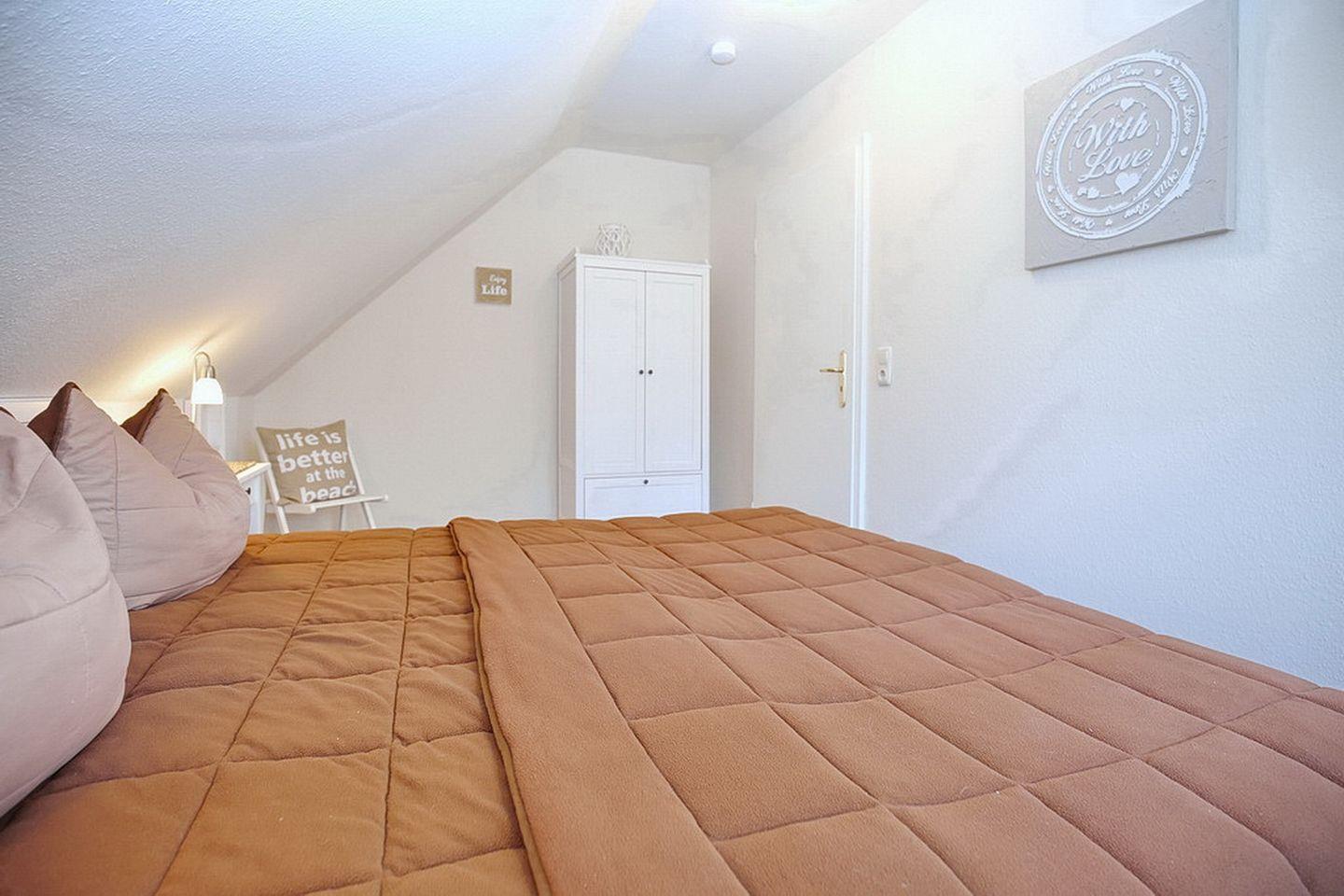 In deinem Schlafzimmer im 1. OG findest du neben zwei Einzelbetten (2 x 90 x 200 cm) auch einen Kleiderschrank vor. Beide Schlafzimmer im Dachgeschoss sind mit jeweils einem Doppelbett (2 x 90 x 200 cm und 2 x 80 x 200 cm) und einem Kleiderschrank eingerichtet. In einem Schlafzimmer befindet sich an dem Fenster ein Rollo zur Verdunkelung. An den anderen ein lichtdurchlässiges Plissee. Der Bodenbelag im 1. OG ist Laminat. Das Dachgeschoss ist mit Laminat ausgelegt.