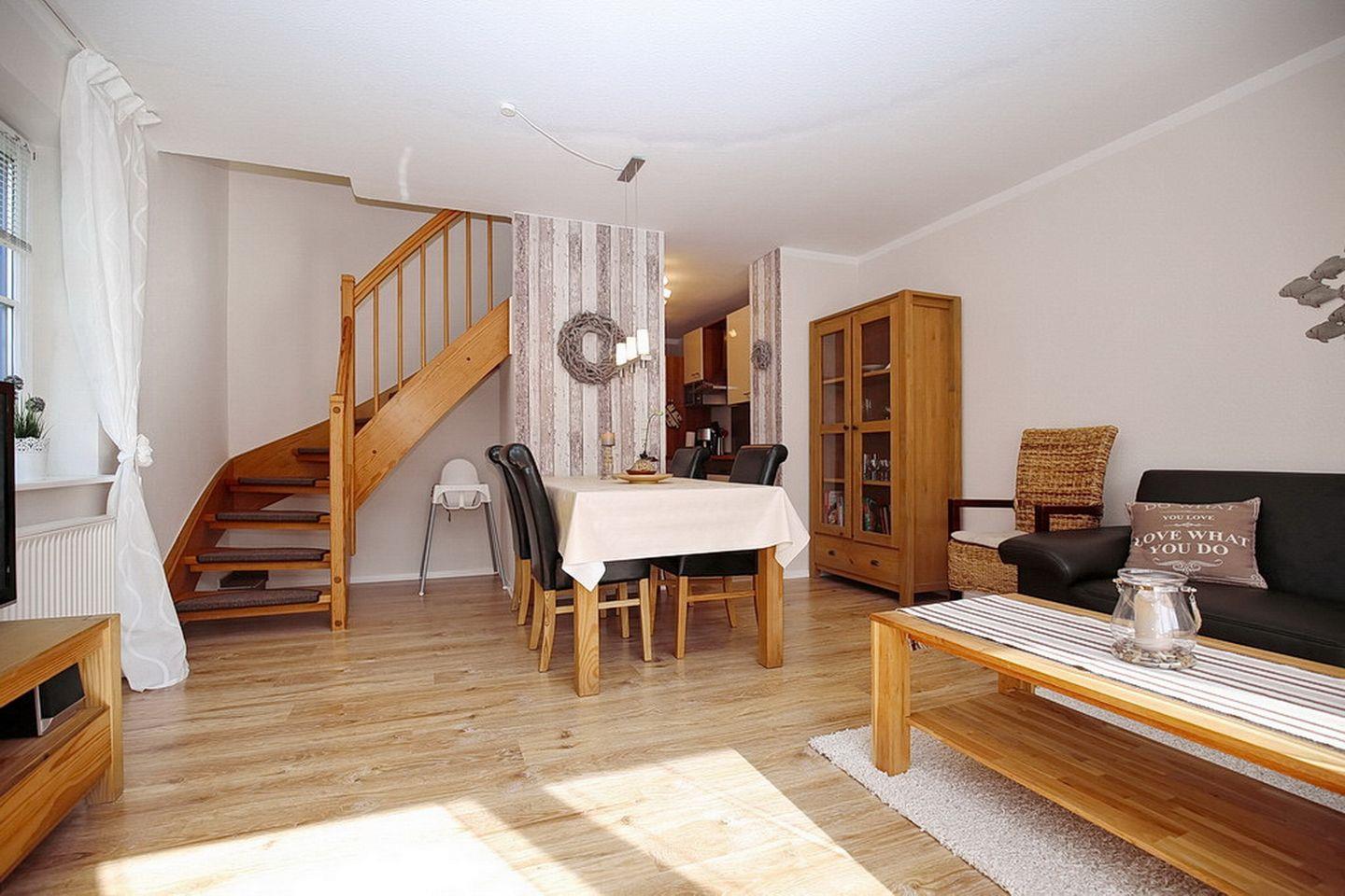 Dein Wohnzimmer auf der unteren Ebene ist mit einer gemütlicher Couch und einem Essbereich für sechs Personen ausgestattet. Für Abwechslung sorgen ein Flachbild-TV, ein DVD-Player, eine Stereoanlage und eine gute Auswahl an Büchern und Spielen für Groß und Klein. Über die innenliegende Treppe erreichst du die beiden Schlafzimmer im Dachgeschoss.