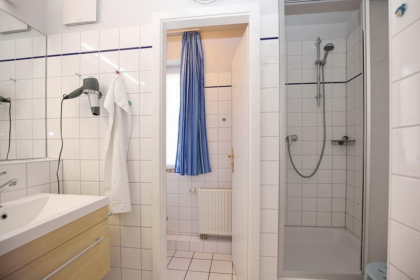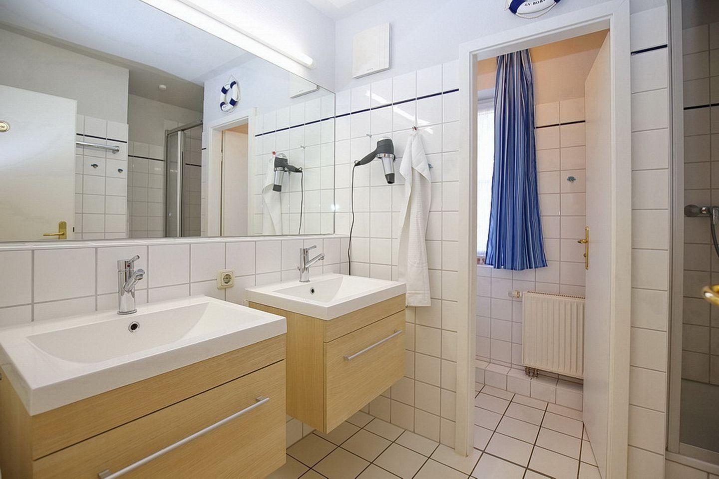 Im großen Duschbad mit zwei Waschbecken gibt es ein separates WC mit einem Fenster. Fahrräder können im Fahrradständer am Haus abgestellt werden. In dieser Nichtraucherwohnung sind maximal zwei Haustiere erlaubt.