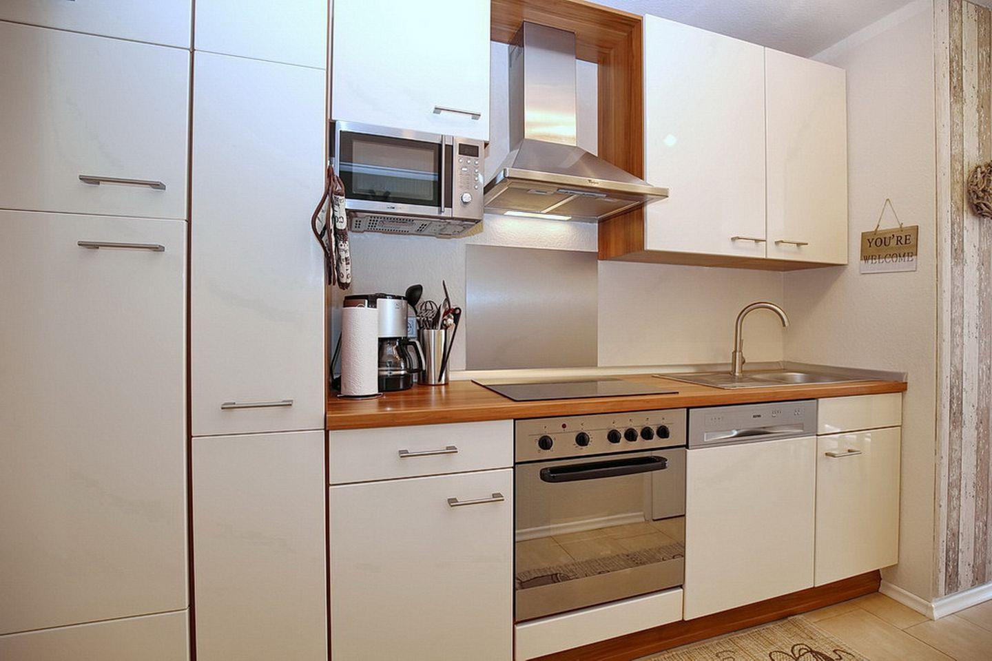 Die integrierte Küchenzeile ist vollständig ausgestattet mit Geschirrspüler, 4-Platten-Cerankochfeld, Backofen und Kühlschrank mit Gefrierfach. Der kleine Abstellraum liegt gegenüber der Küchenzeile. Für deine kleinen Gäste steht auch ein Hochstuhl bereit.
