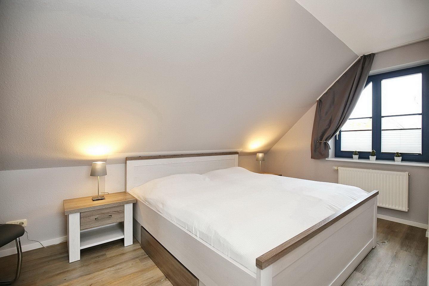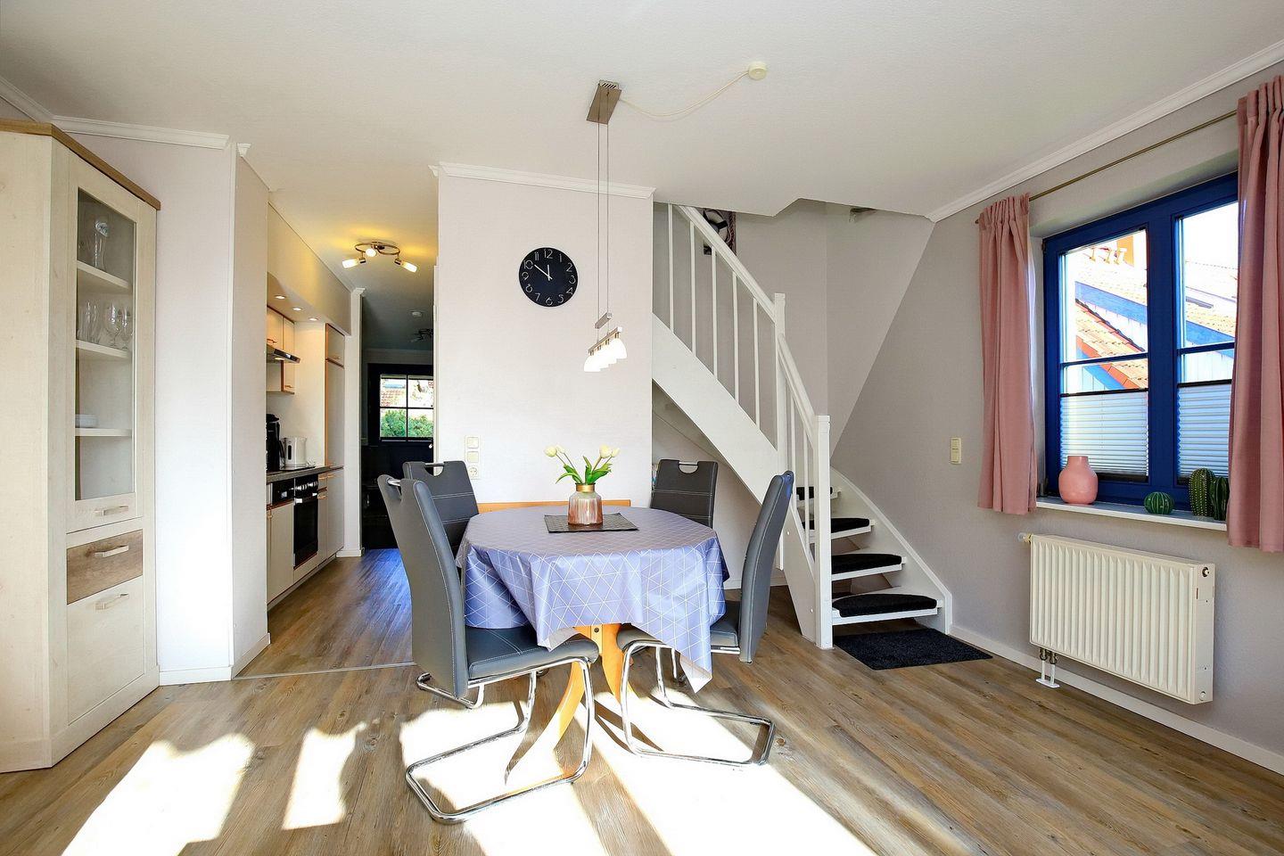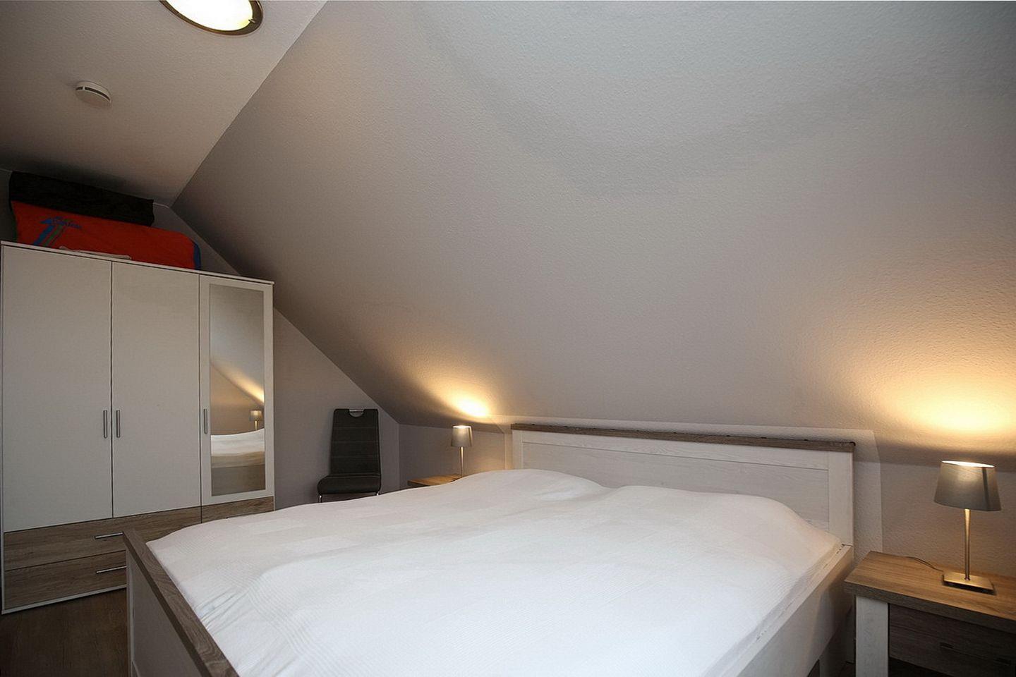 Auf ca. 68 m² bewohnst du im 1. OG des Hauses 14 die Ferienwohnung. Zu der über zwei Etagen verlaufenden 4- Zi.-Wohnung gehört ein Balkon, der nach Süd-Ost ausgerichtet ist. Du bewohnst drei Schlafzimmer, einen Wohn- und Essbereich, ein Duschbad und eine Küchenzeile. Die Entfernung zum Strand beträgt ca. 250 m.