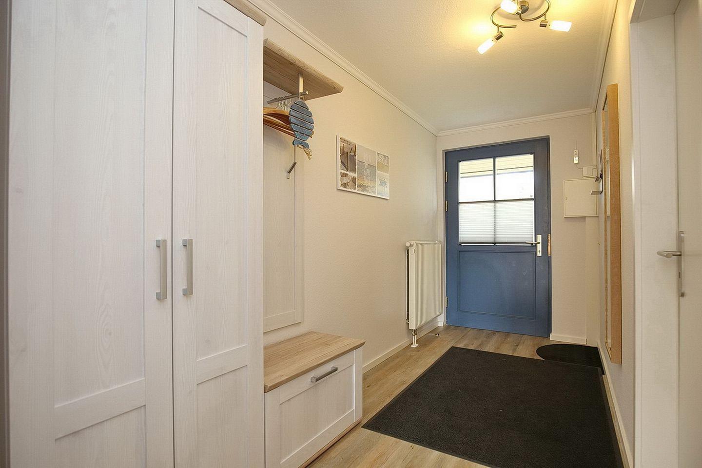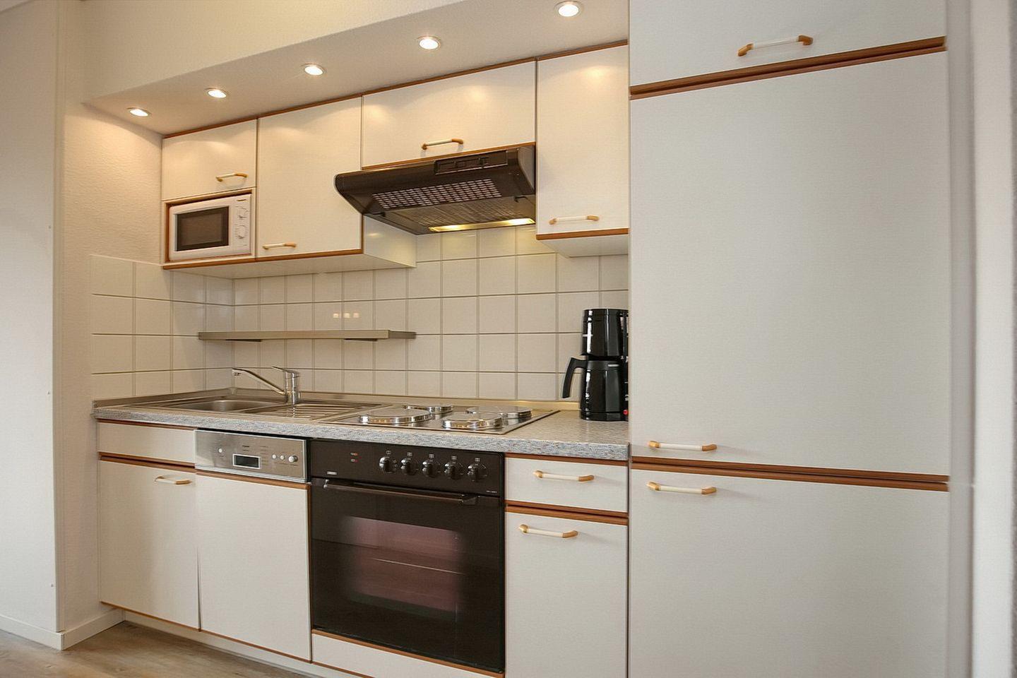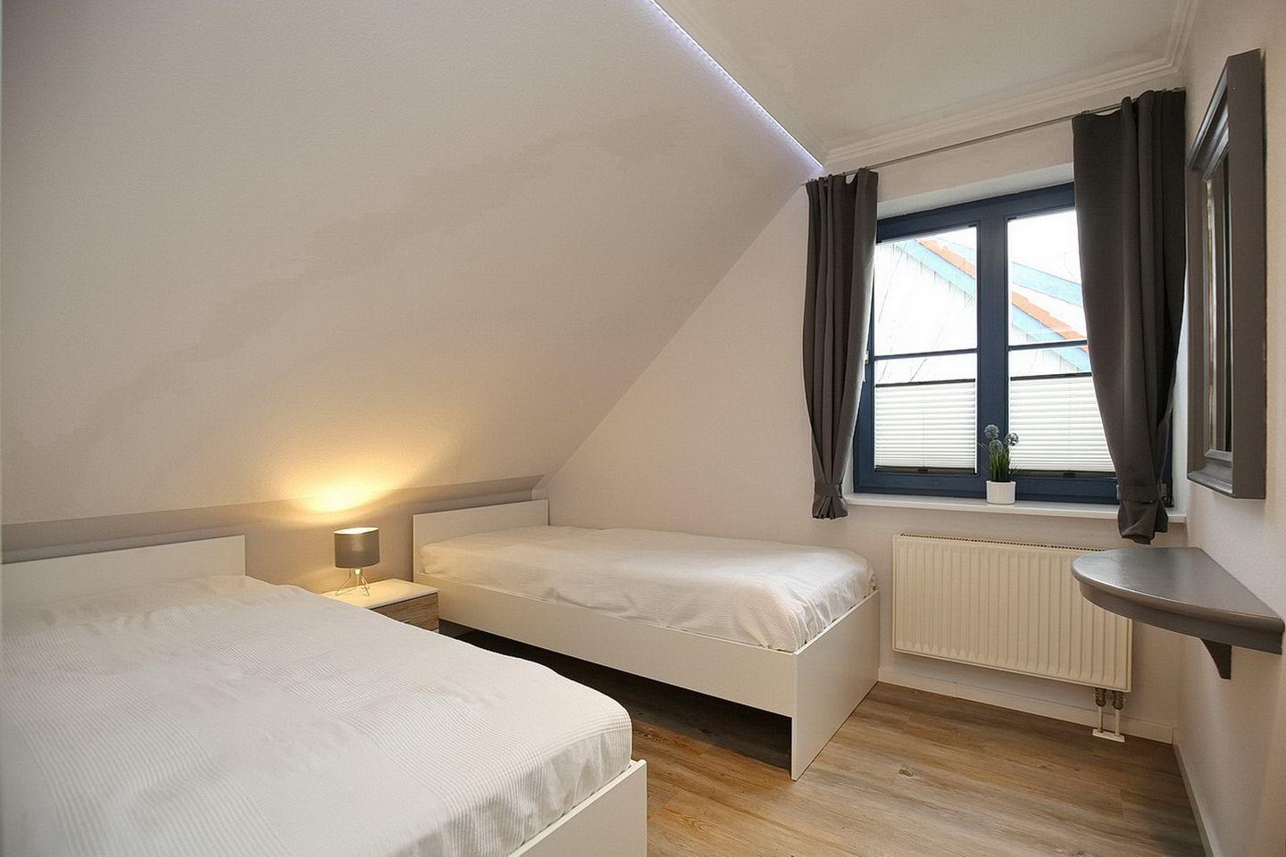 Die 2025 renovierte Küchenzeile ist mit einem Cerankochfeld mit Backofen, einem Geschirrspüler und einem Kühlschrank mit Gefrierfach ausgestattet. Als Bodenbelag wurde in der unteren Etage Design-Belag gewählt. Für eine erholsame Nacht sorgen im Schlafzimmer im Untergeschoss zwei Einzelbetten (90 x 200 cm). Dein Urlaubsgepäck kannst du im Kleiderschrank verstauen.