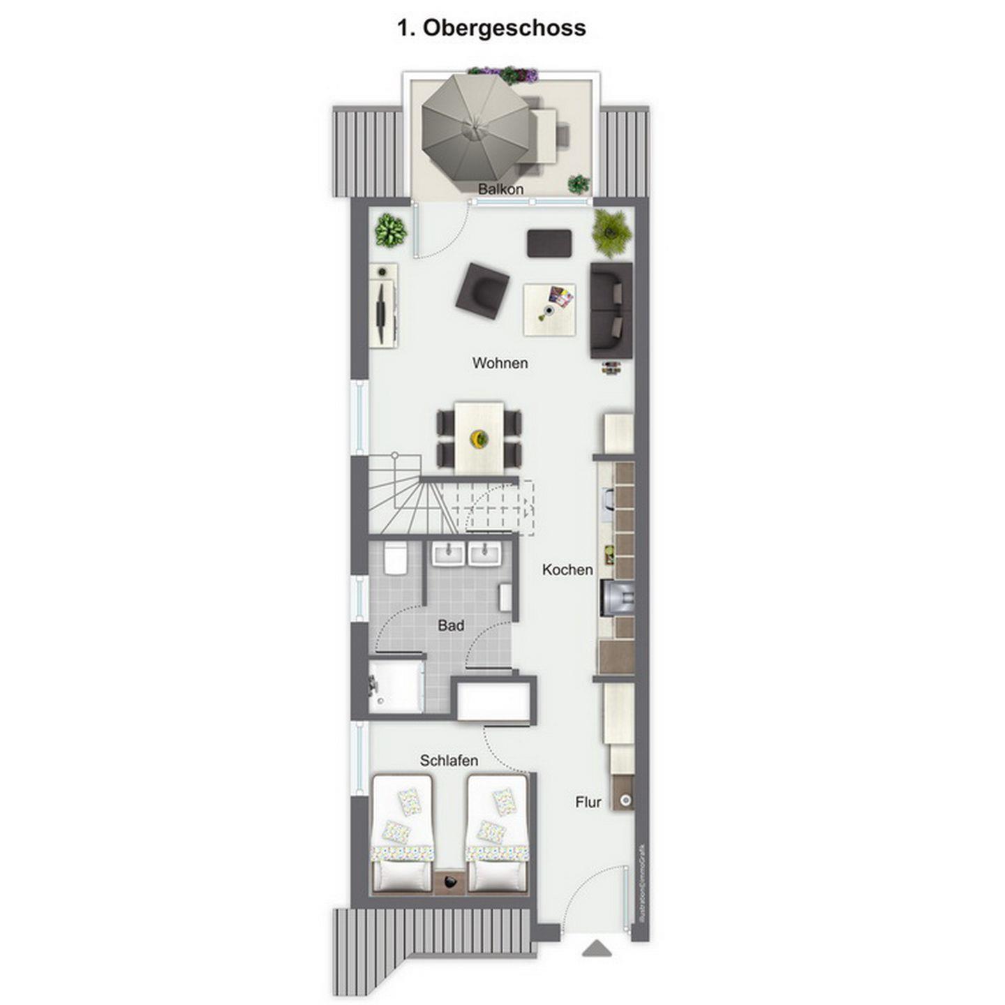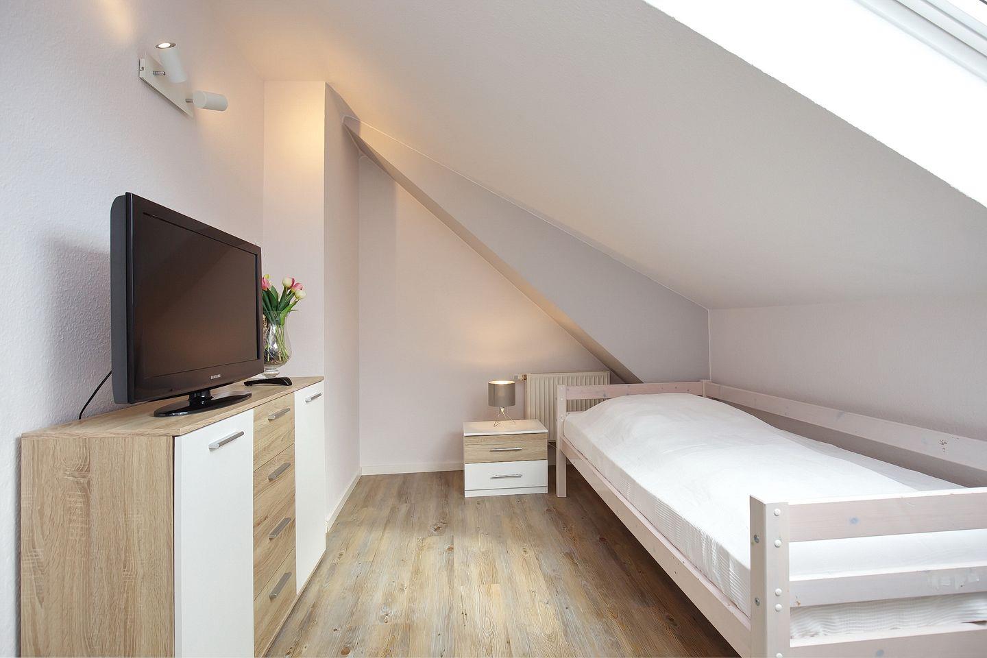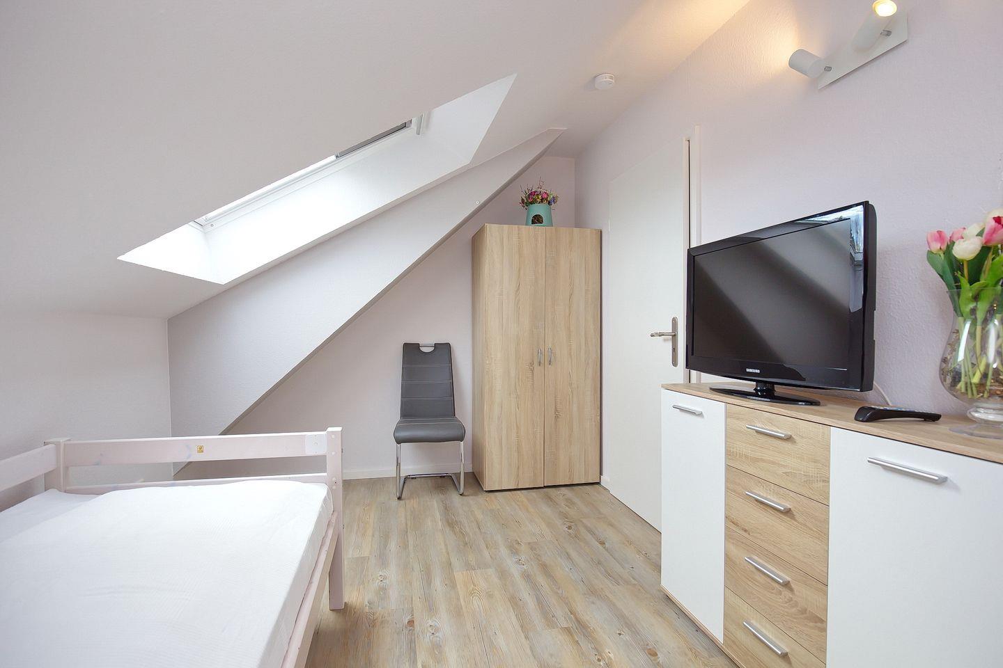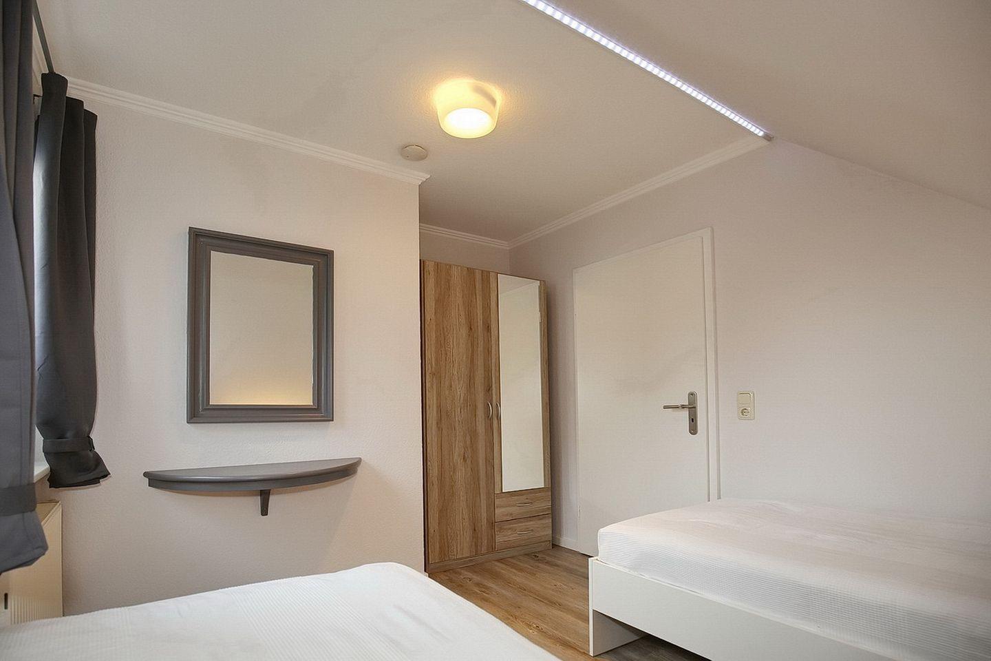 Über eine innenliegende Treppe im Wohnbereich erreichst du zwei weitere Schlafräume. Diese sind mit einem Doppelbett (180 x 200 cm), einem Einzelbett (90 x 200cm) und einem Kleiderschrank ausgestattet. In allen Schlafbereichen wurden an den Fenstern zur Abdunkelung Rollos angebracht. Der Boden ist im Obergeschoss mit Designbelag ausgelegt.