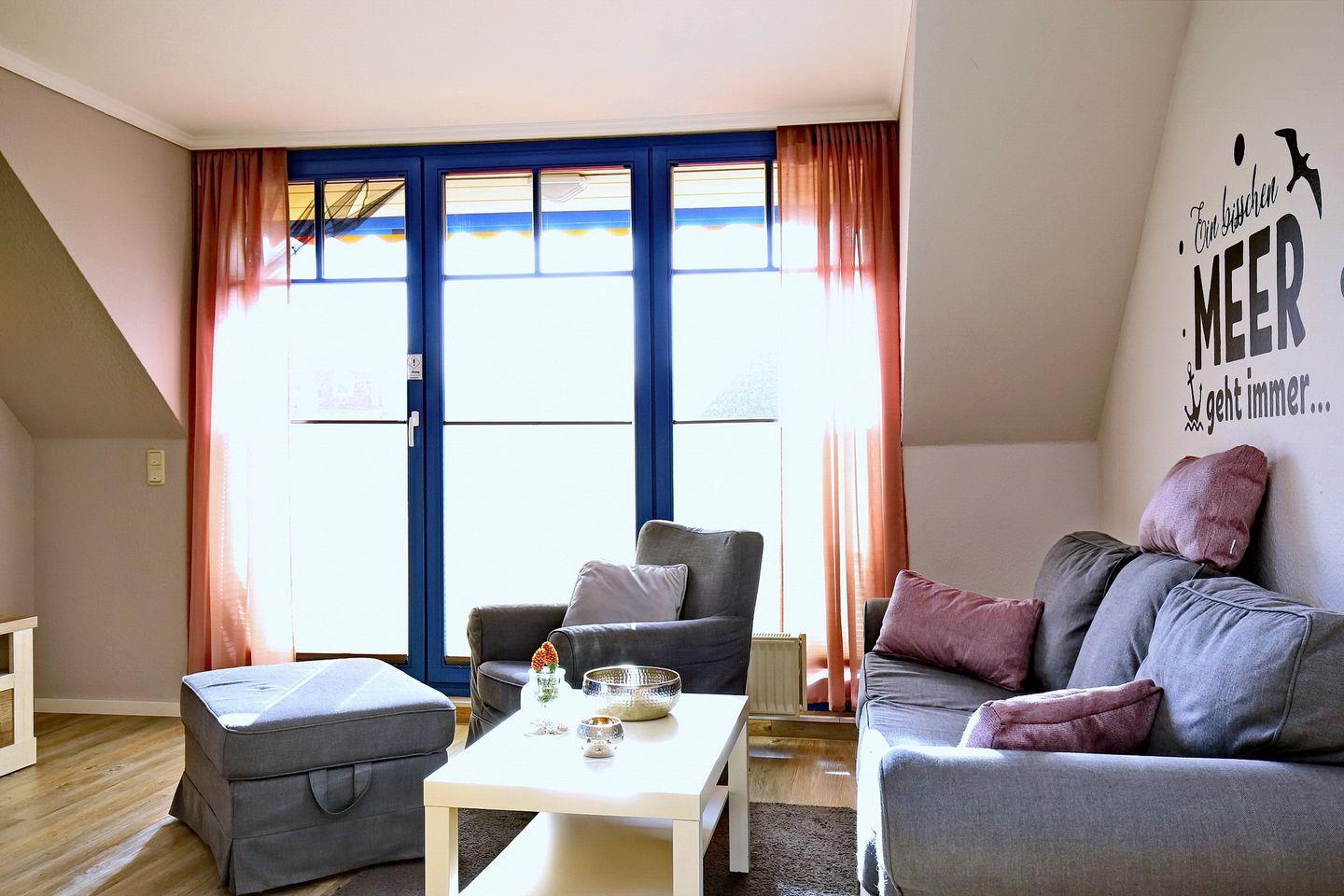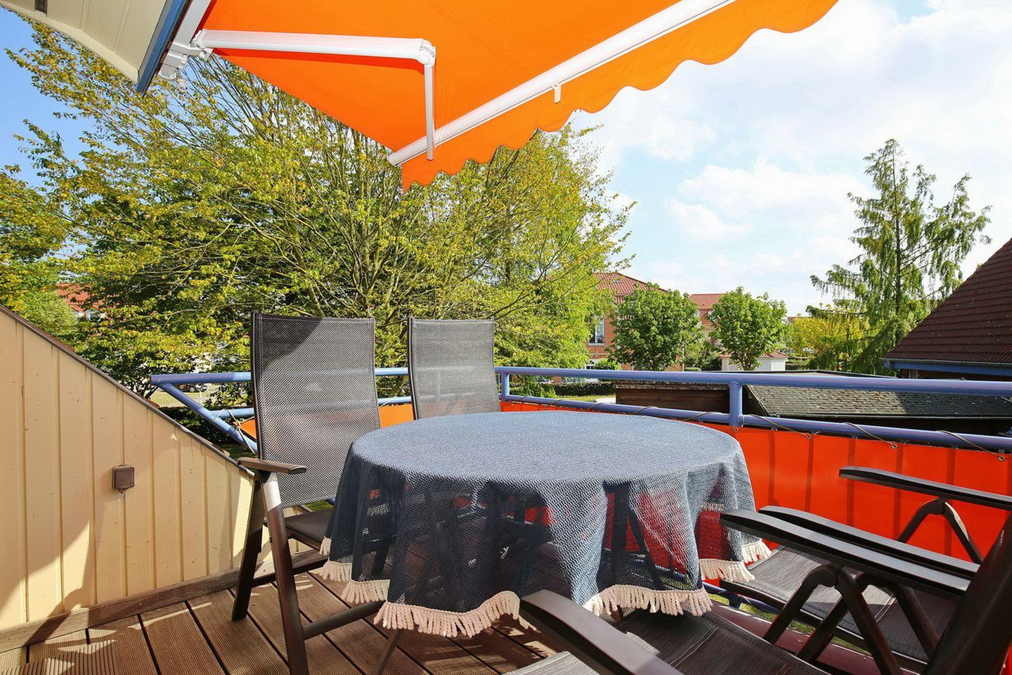 Nutze die Möglichkeit, auf dem möblierten Balkon die Sonne ausgiebig zu genießen. Dieser schließt sich dem Wohnbereich direkt an. Das moderne Wohnzimmer ist mit einem Essplatz und einem gemütlichen Sofa ausgestattet. Für Kurzweil sorgen ein Flachbild -TV und eine Stereoanlage.